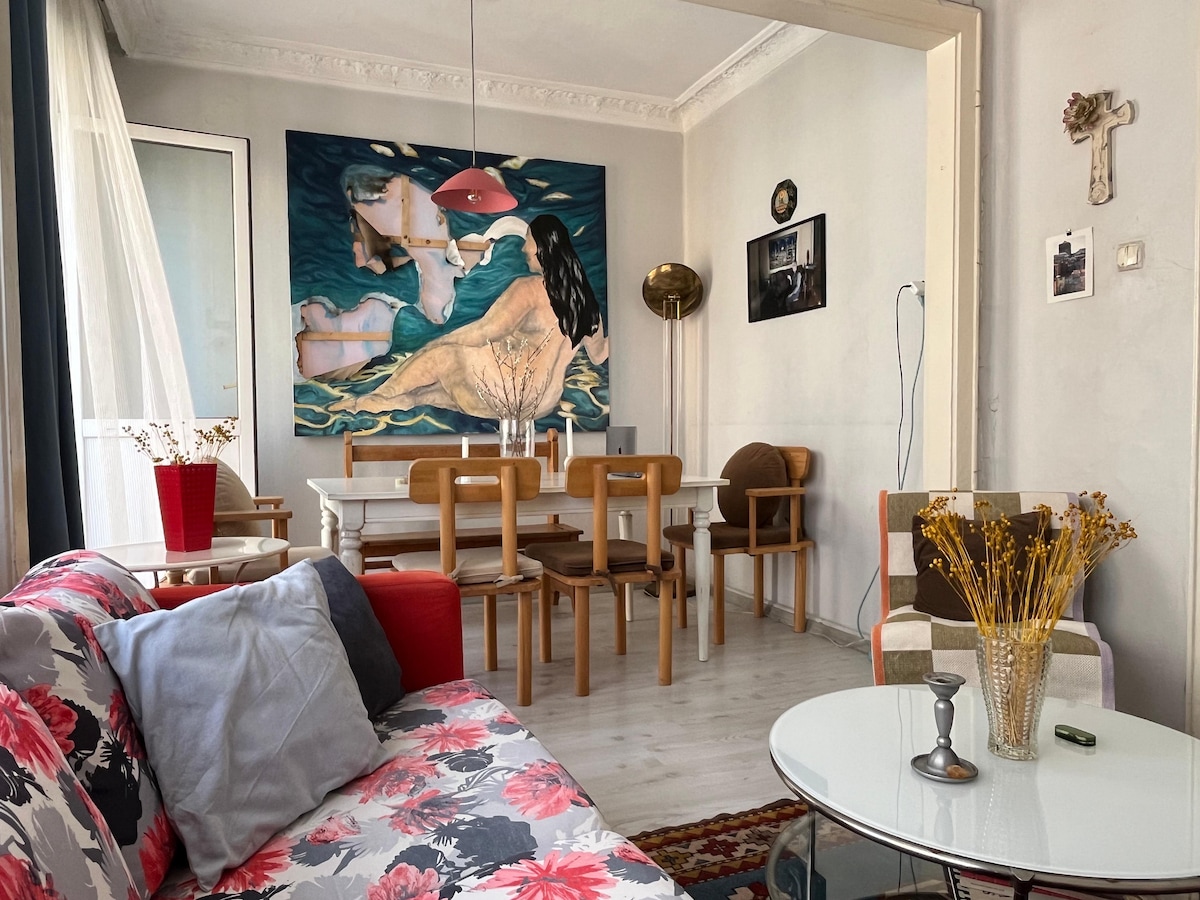 This is a warm and historical flat with a 310 cm ceiling height and a total area of 110 sqm in the very heart of Istanbul's bohemian neighborhood of Cihangir to let for stays for 2 to 5 people. 10 min walk (700 mt) to reach Taksim Square, Istiklal Street, Orhan Pamuk's Museum of Innocence, Mimar Sinan University Tram stop. Nicely vintage furnished big living and dining room, a fully equipped Kitchen, bathroom, 2 bedrooms (1 queen size bed and 2 beds), a veranda and balcony (where you can smoke).
