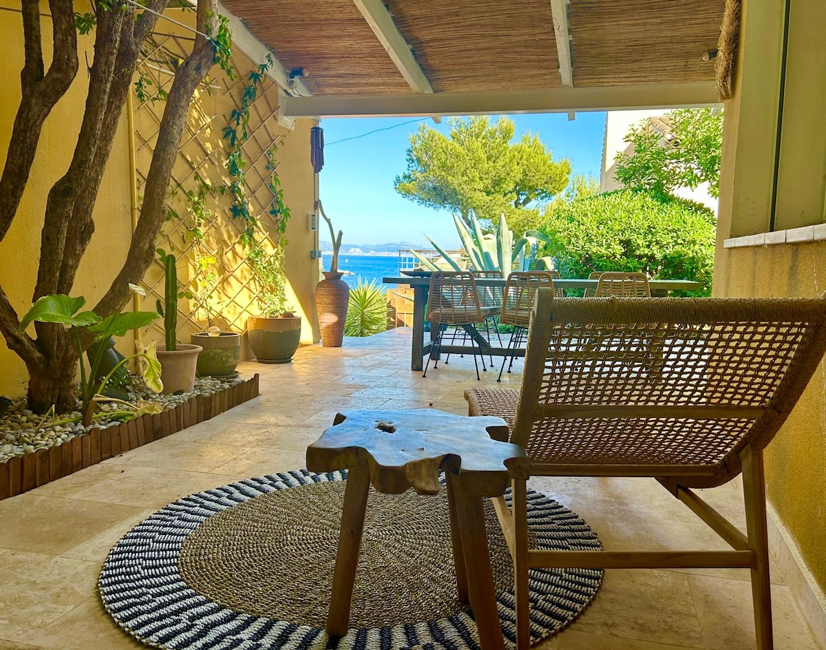 Venez vous détendre sur la cote bleue dans notre villa d'architecte. Dans un style des années 70, vous profiterez d'un grand séjour de 70M2, cuisine équipée, suite parentale avec balcon vue mer, 2 chambres à l'étage dont une avec terrasse vue mer .Profitez de la grande piscine avec plongeoir, ou choisissez la plage à 300m. 1 Kayak 2 places et 1 Kayak 1 place et demi sont à votre disposition. Plancha et barbecue sous le patio.