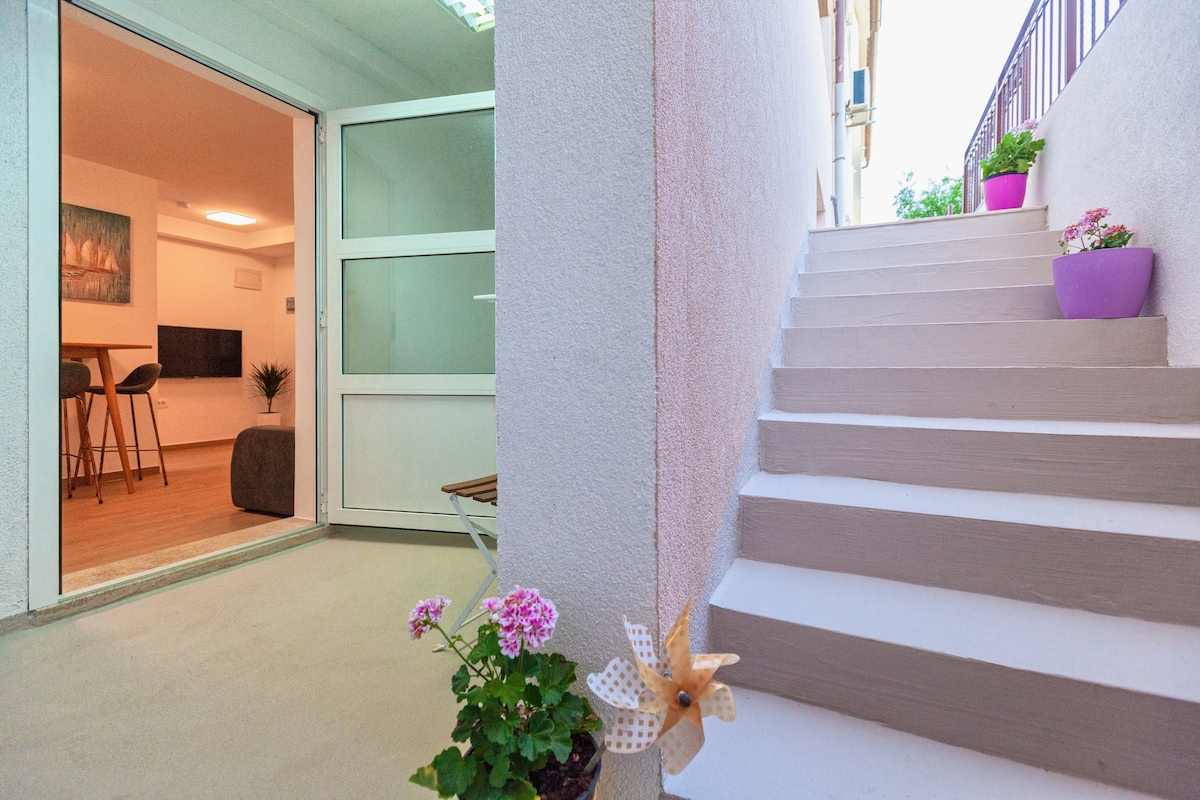 moderno potpuno opremljeni apartman sa lijepim pogledom na more i kvarnerske otoke, smiješten na prvom katu i zasebnim ulazom sa velikom terasom od 60 Ovaj se apartman nalazi u obiteljskoj kući i ima pogled na more.Udaljen je 800 m od šljunčane plaže, i 400 m od centra . Smještajna jedinica ima potpuno opremljenu kuhinju, SAT i besplatni Wi fi,apartman je aklimatiziran ali se korištenje klime plaća naknada po satu 1 € po korištenju (climacard)Besplatni parking u blizini ili na ulici.