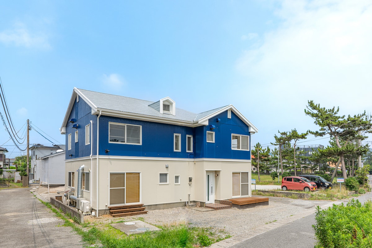 A unique, newly constructed, modern family beach house one minute walk to a beautiful surf beach. All modern facilities with a large living, dining entertainment area and rooftop. 4 bedrooms with individual work spaces for remote work. Situated in a quiet fishing village with convenient access to Tokyo, Haneda and Narita by car or train.