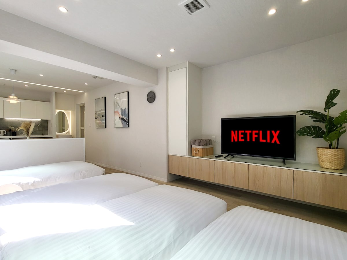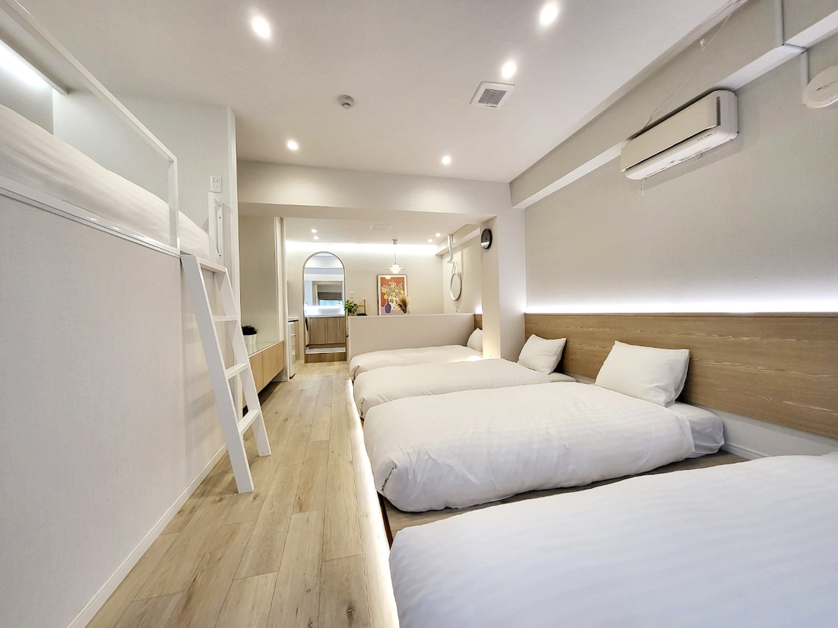 このリスティングは、3世代の家族や仲間と中長期の滞在を楽しむ拠点に向いています。 都心に近い静かな住宅エリアにある2023年オープンのアパートメントホテルです。周辺には水辺、公園、神社があります。 74㎡の広々とした室内は3つのベッドルームがあります。2台のセミダブルベッド、2台のシングルベッド、2組の布団、ソファーベッドがあり、大人7人まで泊まれます。(2歳未満乳幼児の添い寝は無料です。) 広いキッチン、全自動の洗濯乾燥機、広々としたサイズのバスルーム、独立したトイレは2か所あります。 アンドロイドTVやフリーWi-Fiの環境も整備されていますので、室内で過ごしたりお仕事をするにも充分な環境です。 ゲストに開放されたルーフトップでリラックスすることもできます。 チェックインは、タブレットを使う無人のチェックインシステムですので、深夜でも気兼ねすることはありません。ドアは最新式のタッチキーシステムで管理されています。 最寄りの駅(住吉駅・半蔵門線・都営新宿線)の出口から徒歩5分の場所にあり、近くにはスーパーマーケットなどがあります。