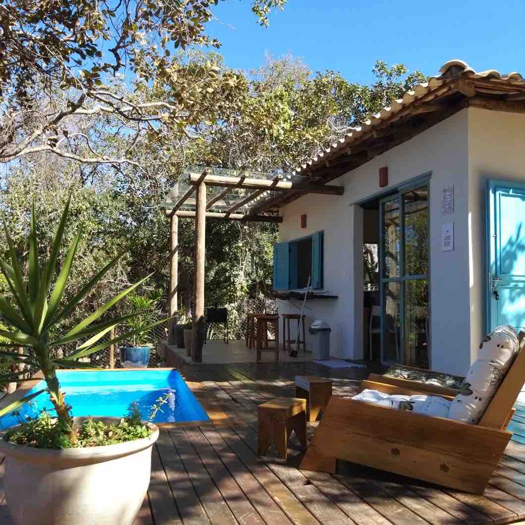 A casa é simples, rustica, tipo roça, com um riacho que passa ao lado e forma piscinas naturais de uso exclusivo dos hóspedes; Pode ser reservada por um casal, uma família, varios casais ou grupo amigos e familiares; a utilização da casa e da area de lazer é exclusivo do locatário Churrasqueira externa, cozinha com fogão à lenha e gás; 5 quartos, sendo 4 suítes com cama de casal e 1 quarto com beliches. O mobiliário é simples e banheiros básicos