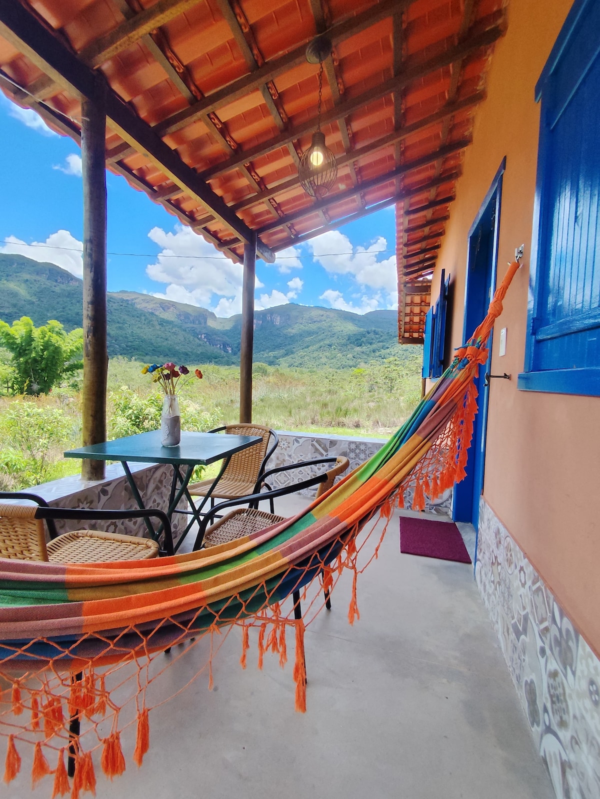 Um refúgio de paz e tranquilidade na natureza próximo ao centrinho da Serra dos Alves, numa rua calma, entre os paredões da Serra do Espinhaço. Da cama, aprecie o Cânion Boca da Serra pela varanda interna; da externa, admire a Pedra da Serra dos Alves. O espaço conta com cozinha equipada e banheiro espaçoso. Perfeito para casais que buscam momentos especiais em meio à natureza. Temos outro bangalô ao lado (airbnb.com.br/h/obangalodaserraterra) em caso de mais pessoas.