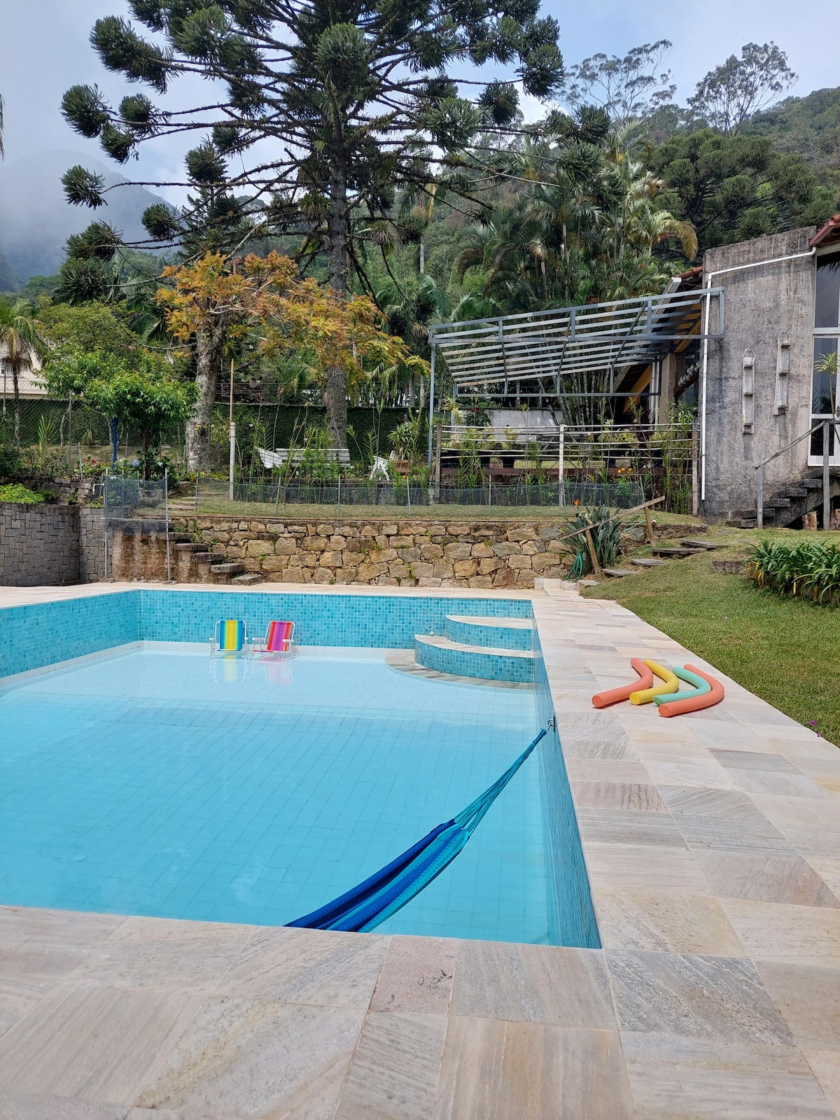 Ideal para descanso e lazer com a família e confraternização com amigos, nosso espaço é aconchegante e bem equipado. Possui área externa com jardins, pomar, caminho de coqueiros, mirante e deck com vista para a mata. O espaço pode ser desfrutado o ano inteiro, pois o clima é favorável com temperatura entre 18 a 32 °C. A apenas 65 Km de distância do Rio de Janeiro. O comércio fica a cerca de 12 km. Perfeito para curtir momentos junto à natureza, com conforto, segurança e tranquilidade.