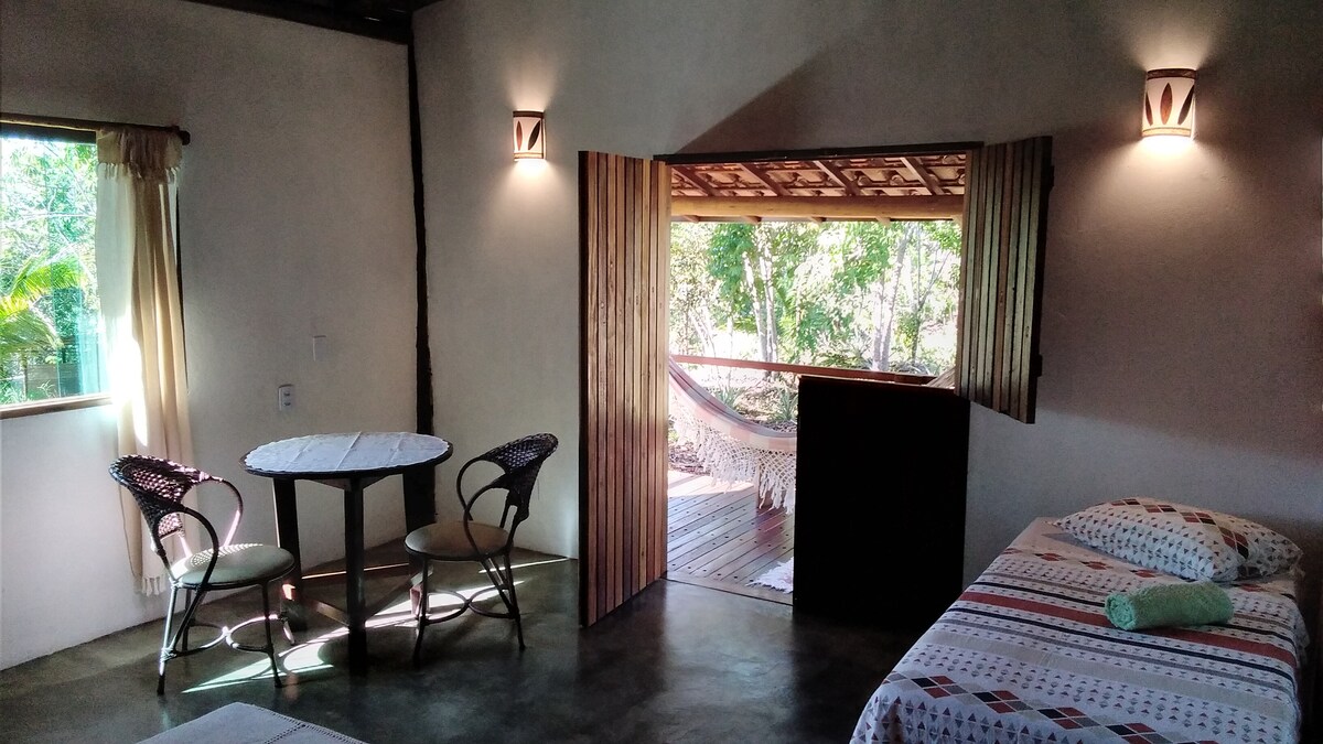 Chalé bem equipado, ideal para 2 pessoas, com possibilidade de colocar mais um colchão de solteiro. Piscina privativa, cozinha completa, banheiro com closet, ampla varanda, com toda a privacidade, cercada de floresta com lindas flores e frutos. Localizado no Sítio Labareda, um lugar que respira Roça e Arte. Aqui você estará em um refúgio, imerso na natureza e perto da vila de Serra Grande, das praias e de Itacaré. * Temos gatos e cachorros no sítio, qualquer questão enviar mensagem.