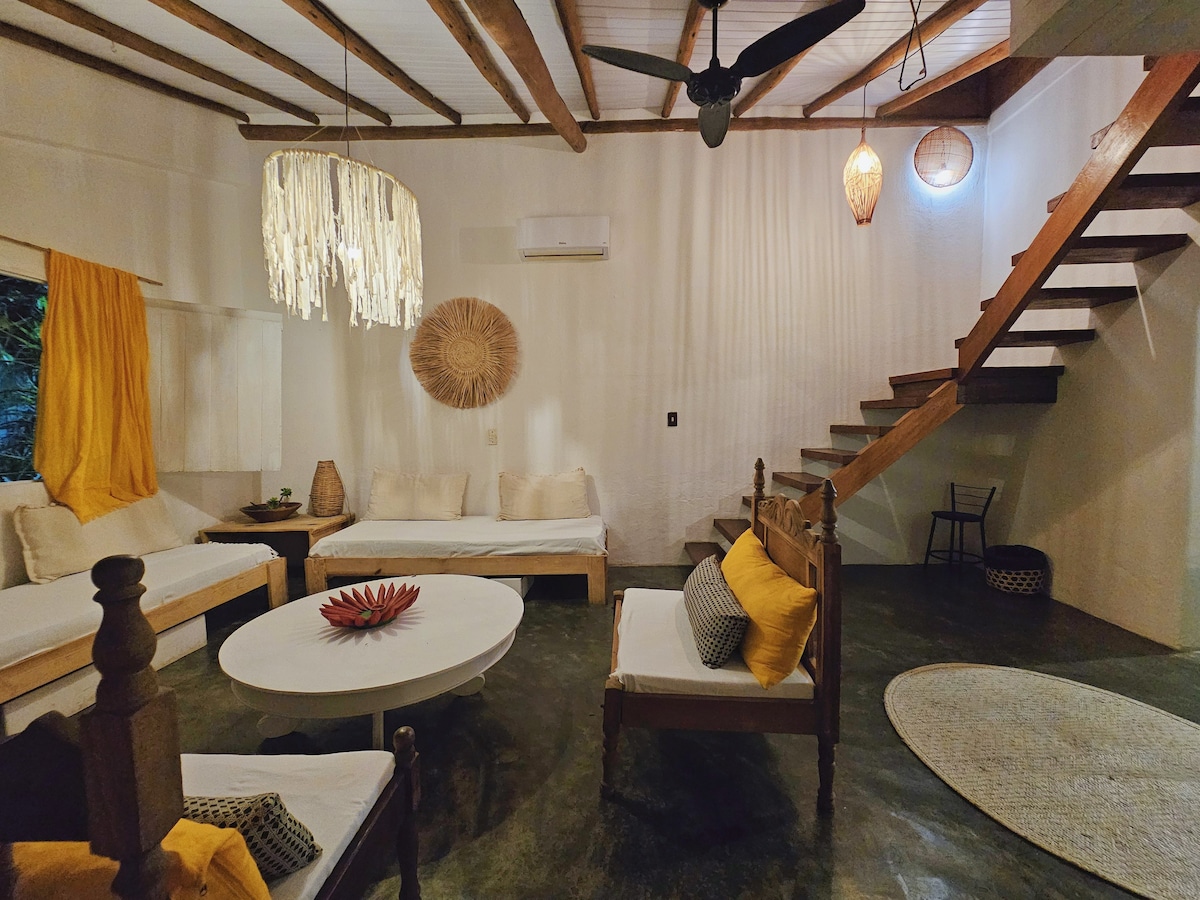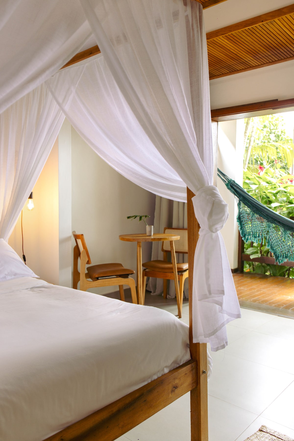 Stay in a modern junglish bungalow just 100m from Concha Beach and a short walk to the sunset spot, shops, and restaurants. Within 10 minutes you can reach Resende, Tiririca, and Ribeira beaches. Each bungalow offers a kitchen, bedroom with mosquito net, living room, bathroom, fast Wi-Fi, and a patio with hammock surrounded by tropical gardens. Enjoy yoga classes in our garden studio, arrange surf lessons or tours, and count on us for local tips to make your stay in Itacaré unforgettable.