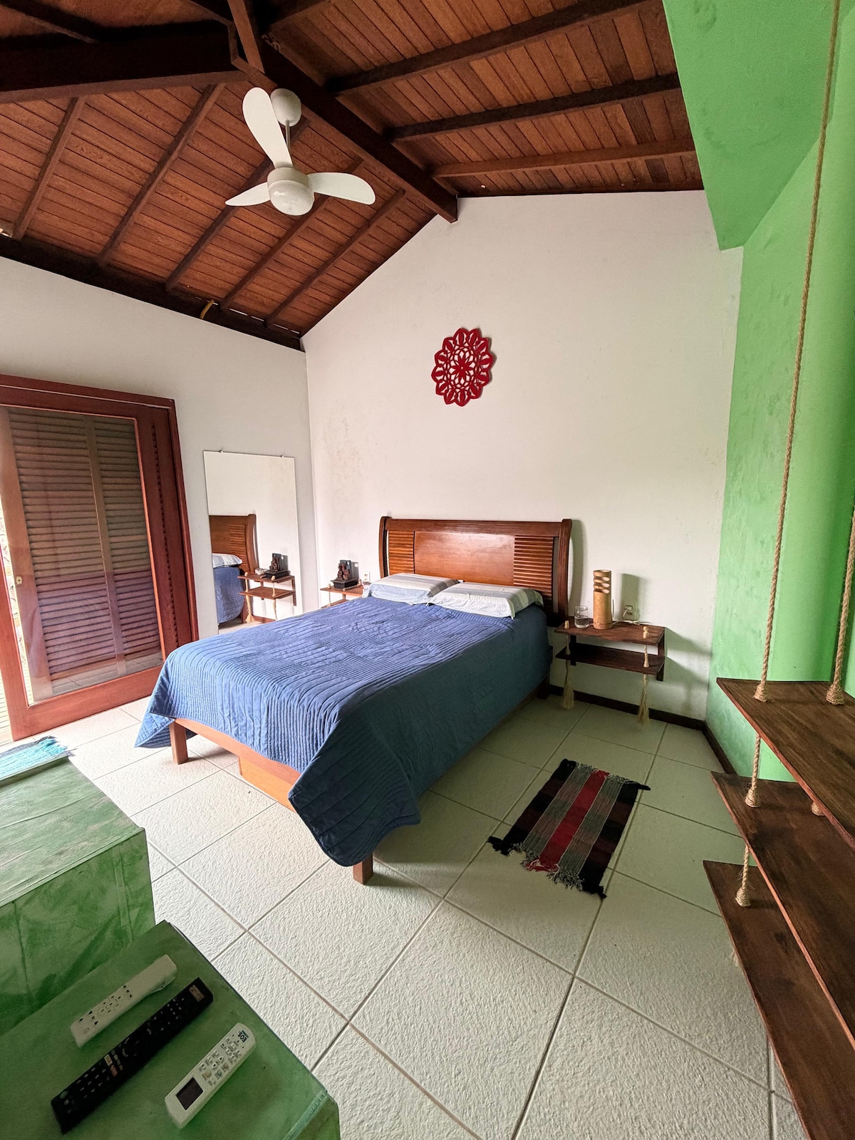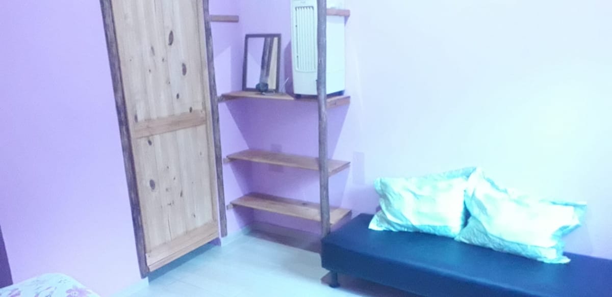 Acomodação térrea de 20 mts2, Wifi, banheiro privativo, chuveiro quente, frigobar, pia, torradeira, uma cama de casal com travesseiros feita e toalhas. Oferecemos estacionamento privado, chave eletrônica do portão, e lavanderia (acessórios de limpeza como vassouras, pá, rodo e panos). E' um sitio de 1300 mts 2 com biodiversidade. Na propriedade ha uma cozinha externa e compartilhada com fogao a gas de 4 bocas e forno, panelas e panelas de pressao, e liquidificador compartilhados.