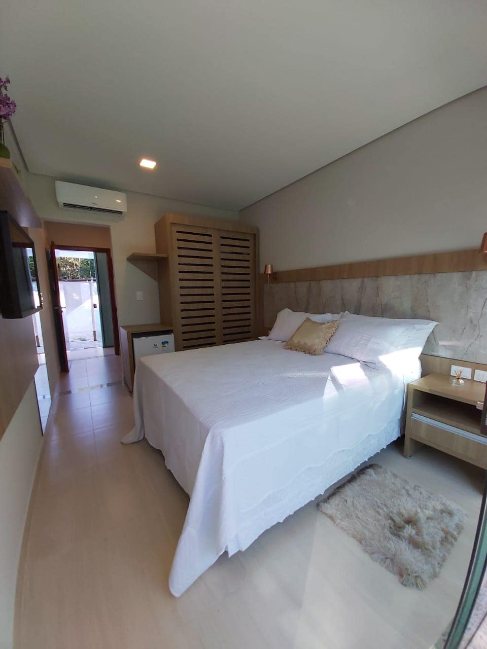 Full room with double bed, possibility of an extra single bed box, split air conditioning, fridge, electric shower, curtains with blackout and LCD TV. Very wide, airy and reserved acoustically.