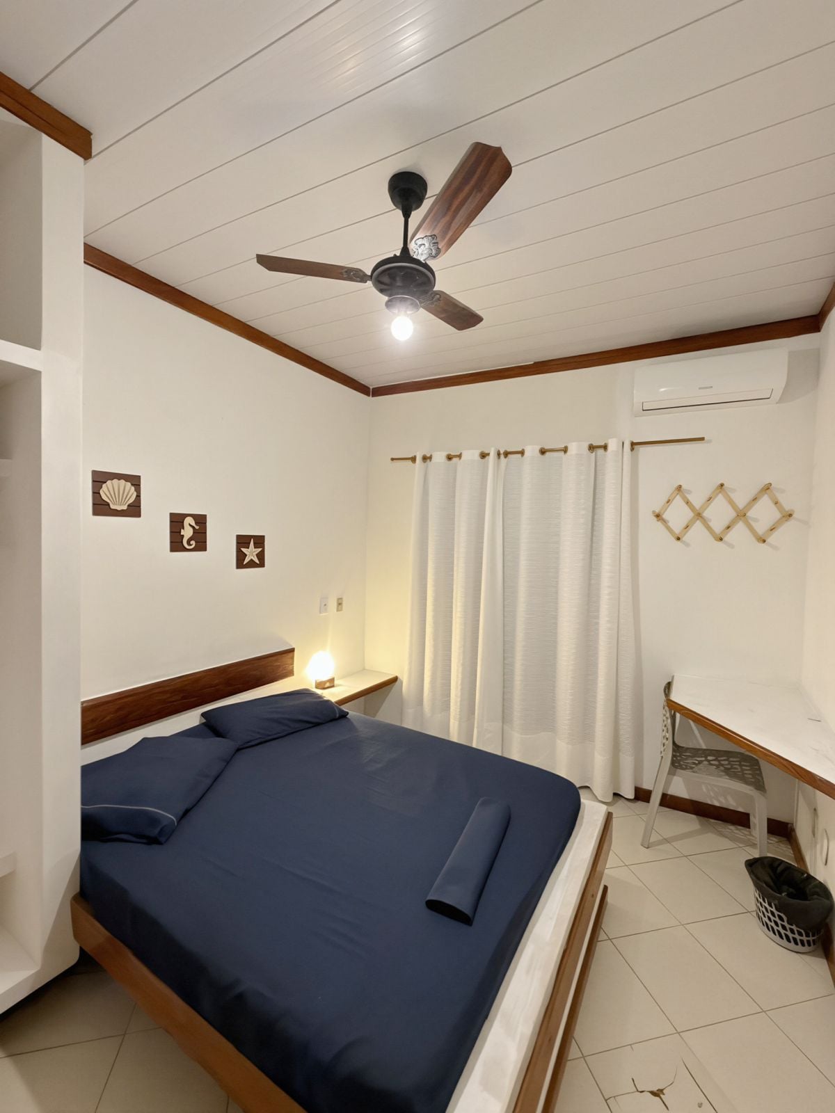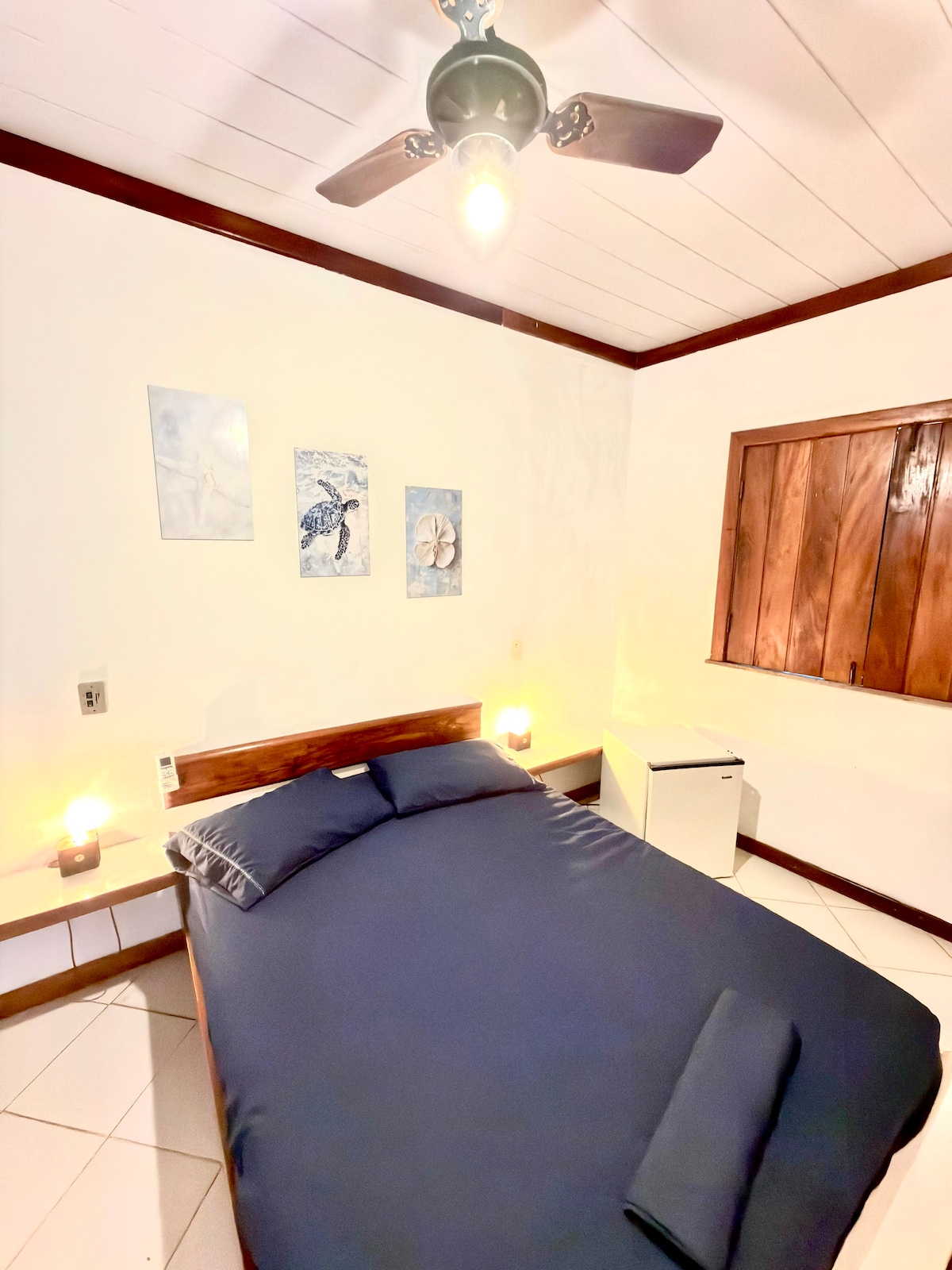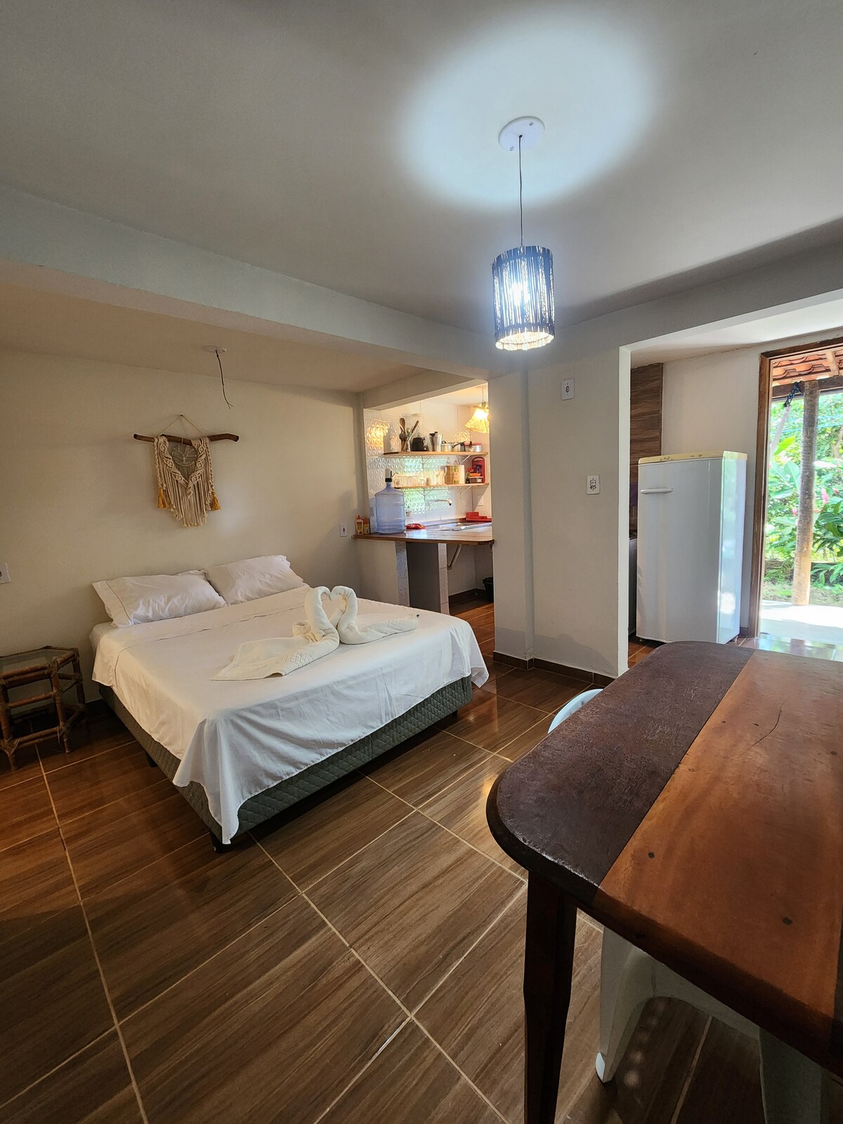 Encante-se com esta charmosa suíte de 18 m², um refúgio de tranquilidade e bem-estar em meio à natureza. Privativa e independente, possui cama queen com mosquiteiro, ar-condicionado, iluminação natural e varanda com rede. Decoração rústica e artesanal, criada pelo proprietário, e espaço de trabalho com boa internet. A cozinha externa é equipada, incluindo churrasqueira. Sustentável, com aquecimento solar e separação de resíduos, além de ducha externa para maior comodidade após a praia.