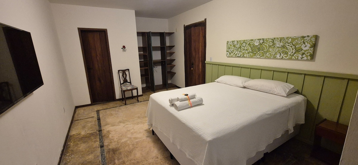 Suíte prática e confortável no centro de Itacaré, com excelente localização para quem deseja mobilidade a pé. Próxima à Pituba, à Passarela da Vila e em frente à orla. A Praia da Concha, ideal para banho, fica a cerca de 7 minutos de caminhada (500 m).
