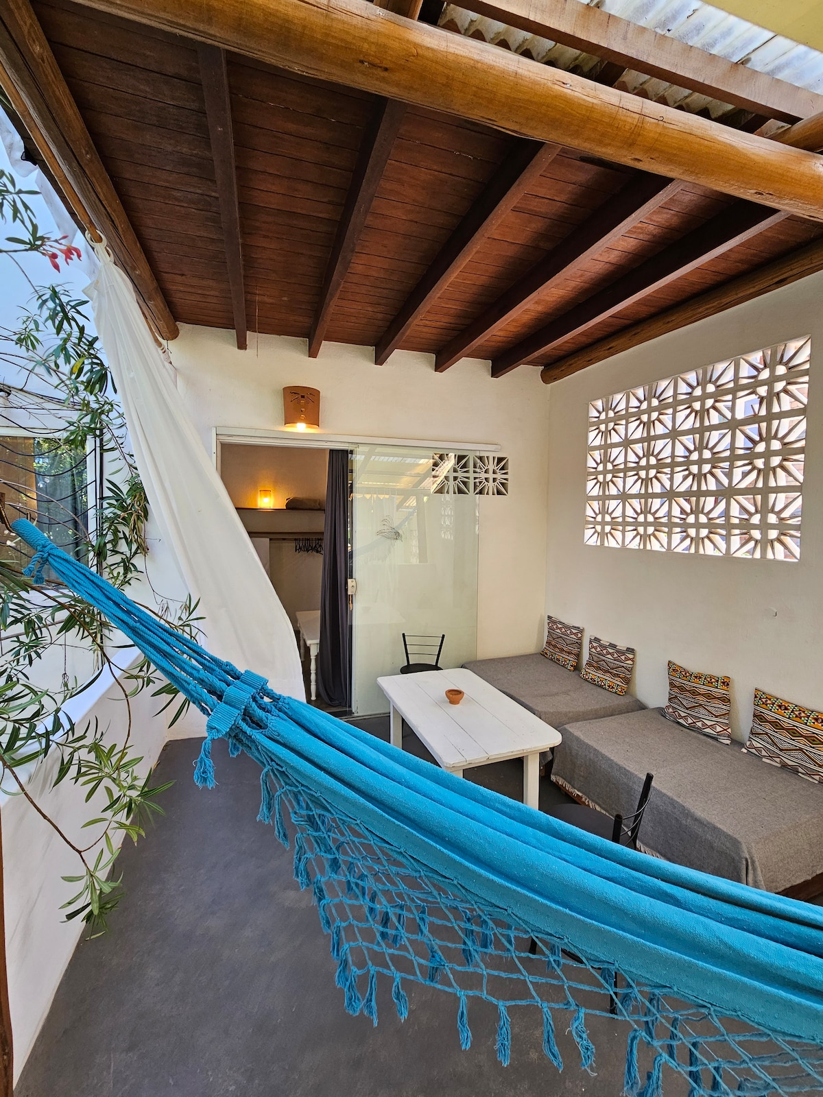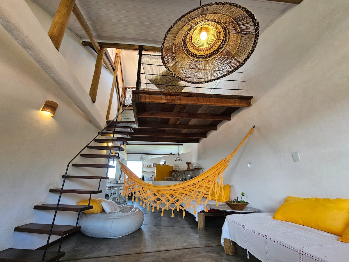 Loft luminoso e arejado no 2º andar, pode acomodar confortavelmente 4 pessoas em volta da sua elegante e estilosa cozinha latino-americana e do seu lounge descolado e colorido. Uma suíte oferece ar e varanda com puffe e rede, enquanto a outra com ventilador colonial reserva uma experiência mais intimista com sua alcova de madeira, banheiro em espiral e janela de muxarabi lembrando a Índia. No lounge, 2 sofás podendo se transformar em camas. Vista para nosso deslumbrante bananal e para mata.