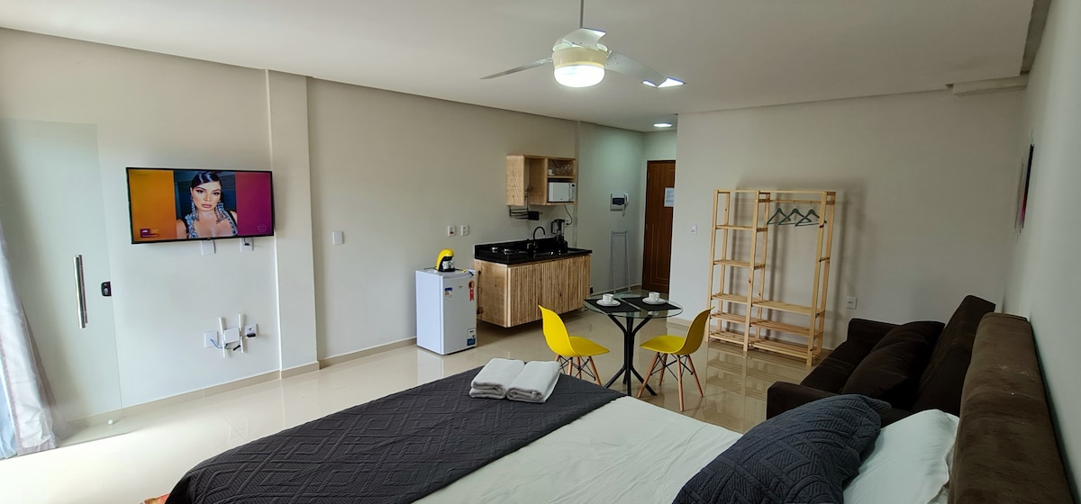 Relaxe neste espaço calmo e cheio de estilo, Perto de todos os acessos da cidade, Bares, Restaurantes, centro histórico, Bancos, correio, supermercados, circuito turísticos Studio espaçoso com área de serviço, equipado com cama de casal Double Queen, sofá cama, Smart tv, ar condicionado split, ventilador de teto, cozinha integrada completa c/ cooktop, frigobar e utensílios, sistema interfone automatizado. ótima internet home office Terraço com uma vista exuberante do Mar, rio e toda a cidade.