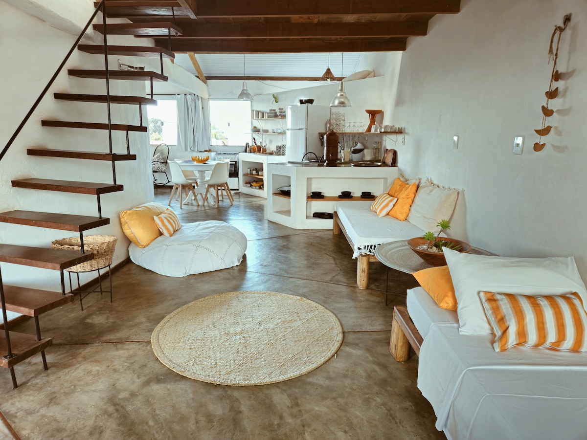 Loft luminoso e arejado no 2º andar, pode acomodar confortavelmente 4 pessoas em volta da sua elegante e estilosa cozinha latino-americana e do seu lounge descolado e colorido. Uma suíte oferece ar e varanda com puffe e rede, enquanto a outra com ventilador colonial reserva uma experiência mais intimista com sua alcova de madeira, banheiro em espiral e janela de muxarabi lembrando a Índia. No lounge, 2 sofás podendo se transformar em camas. Vista para nosso deslumbrante bananal e para mata.