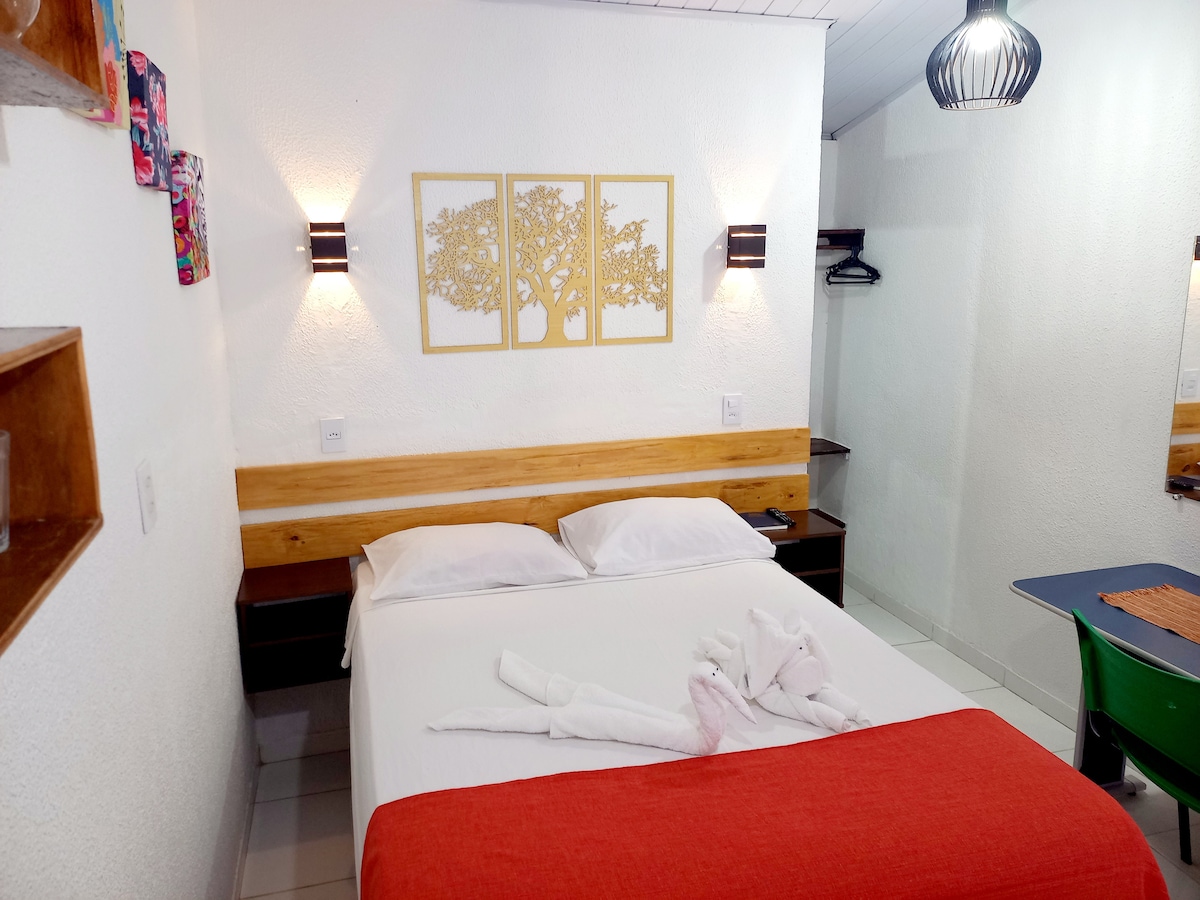 Nosso espaço acomoda até 2 (duas) pessoas. Estamos localizados na principal via turística da cidade e caminho das praias urbanas. O ambiente é estruturado com uma cama de casal, cozinha com utensílios domésticos, fogão, geladeira, TV, internet wifi, ar condicionado, tudo privativo. Excelente pra quem quer boa locomoção e aproveitar ao máximo as belezas da cidade, tendo como apoio um local confortável, agradável e seguro.