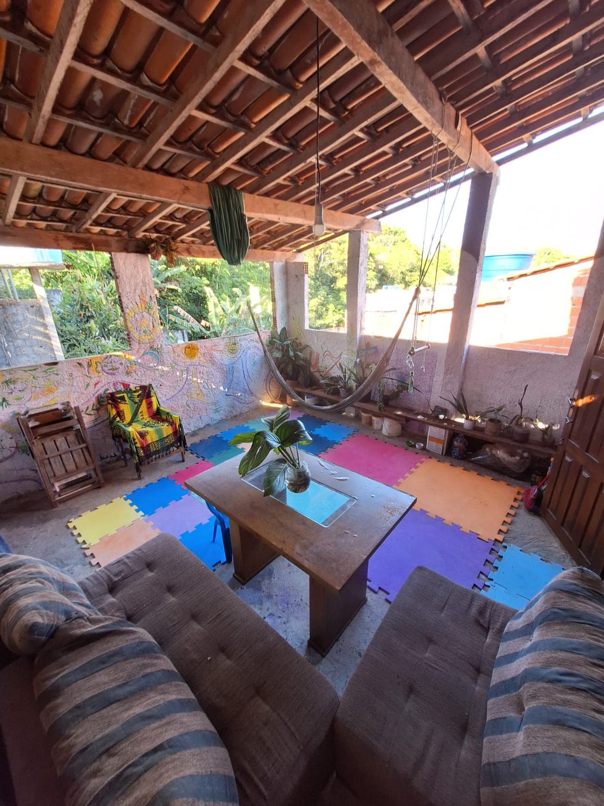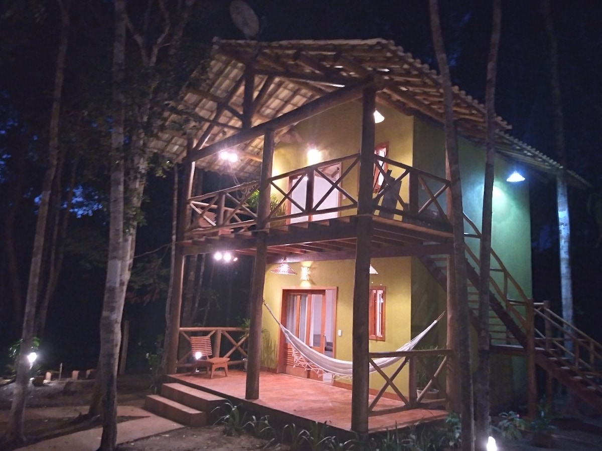 Linda Casa com influência arquitetônica da Polinésia, Bali e o tempero da Bahia. Privacidade Total. Localizada em um sítio de 3.000m², possui 120m²,2 andares, muitas varandas e jardim. Rústica, mista de madeira e muito vidro. Iluminação natural, arejada, silêncio, sem contato visual com vizinhos distantes. Espaçosa e ventilada, fica no alto do morro com visual impressionante para a floresta. Há poucos minutos da trilha para praia de jeribucaçu. 6km da cidade. Ideal para Yoga, Surf e Meditação.
