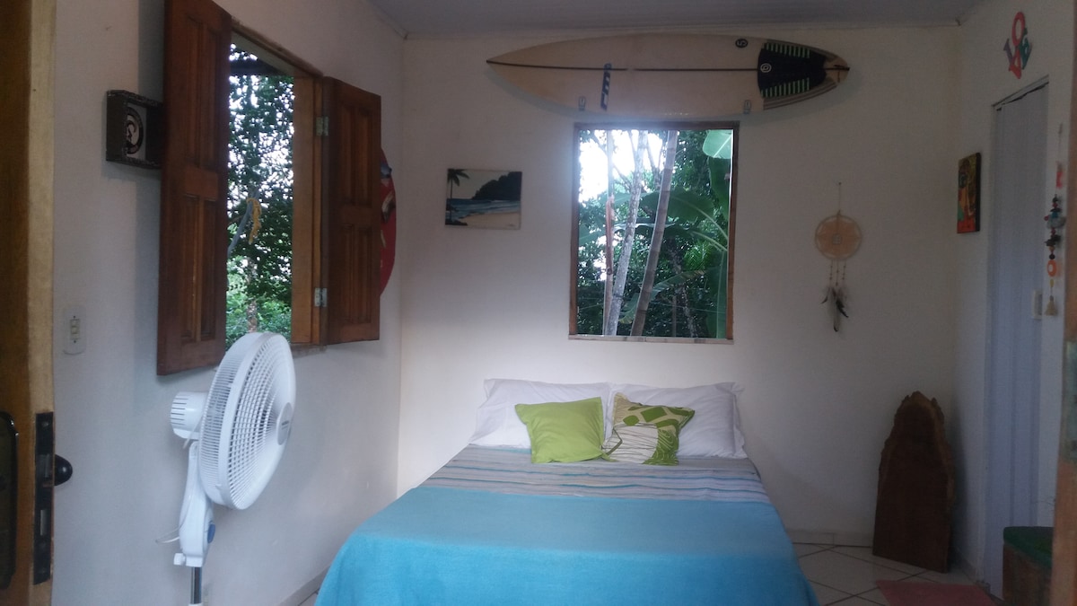 Faça uma pausa para relaxar neste paraíso baiano. Nosso público é na maioria ligado ao surf já que Itacaré e as suas praias são um paraíso para quem ama ou quer aprender a surfar. A suíte conta com uma cama de casal e uma beliche. Tem banheiro privativo, acesso a cozinha compartilhada com o camping, Wi fi, estacionamento gratuito e um visual privilegiado da natureza. Está localizada a 10 km de Itacaré, a minutos da trilha á praia mais linda daqui, Jeribucaçu. Temos 3 cachorros super sociáveis...