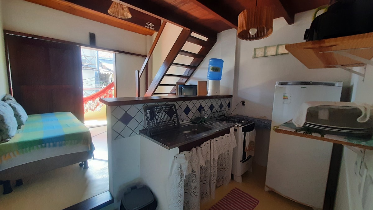 Flat aconchegante em Itacaré, ideal para até 4 pessoas. Possui sala com 2 camas de solteiro, quarto de casal, cozinha equipada e varanda com rede. Localizado no Condomínio Manacá, a 700m das praias da Concha e Tiririca e a 200m da Rua da Pituba. Estacionamento privativo, acesso por escada e ambiente tranquilo. Perfeito para casais, famílias ou amigos que buscam conforto e praticidade.