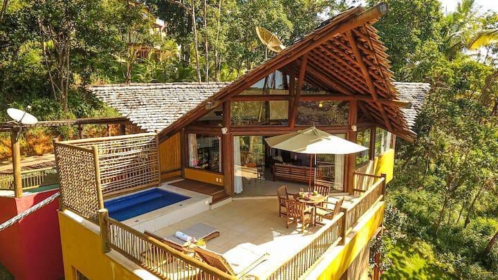 Um refúgio único, no meio das árvores, com vistas deslumbrantes. Perfeito para casais, famílias ou amigos. Acesso direto à Prainha, a mais linda e exclusiva de Itacaré, por escada privativa (em 3 minutos se está com o pé na areia). Maravilhosa piscina com borda infinita, ampla varanda e churrasqueira. Localizada no famoso condomínio Villas de São José, projetada por arquiteto renomado, com móveis de design e obras de arte. Excelente cozinheira à disposição, mediante pagamento de diária.