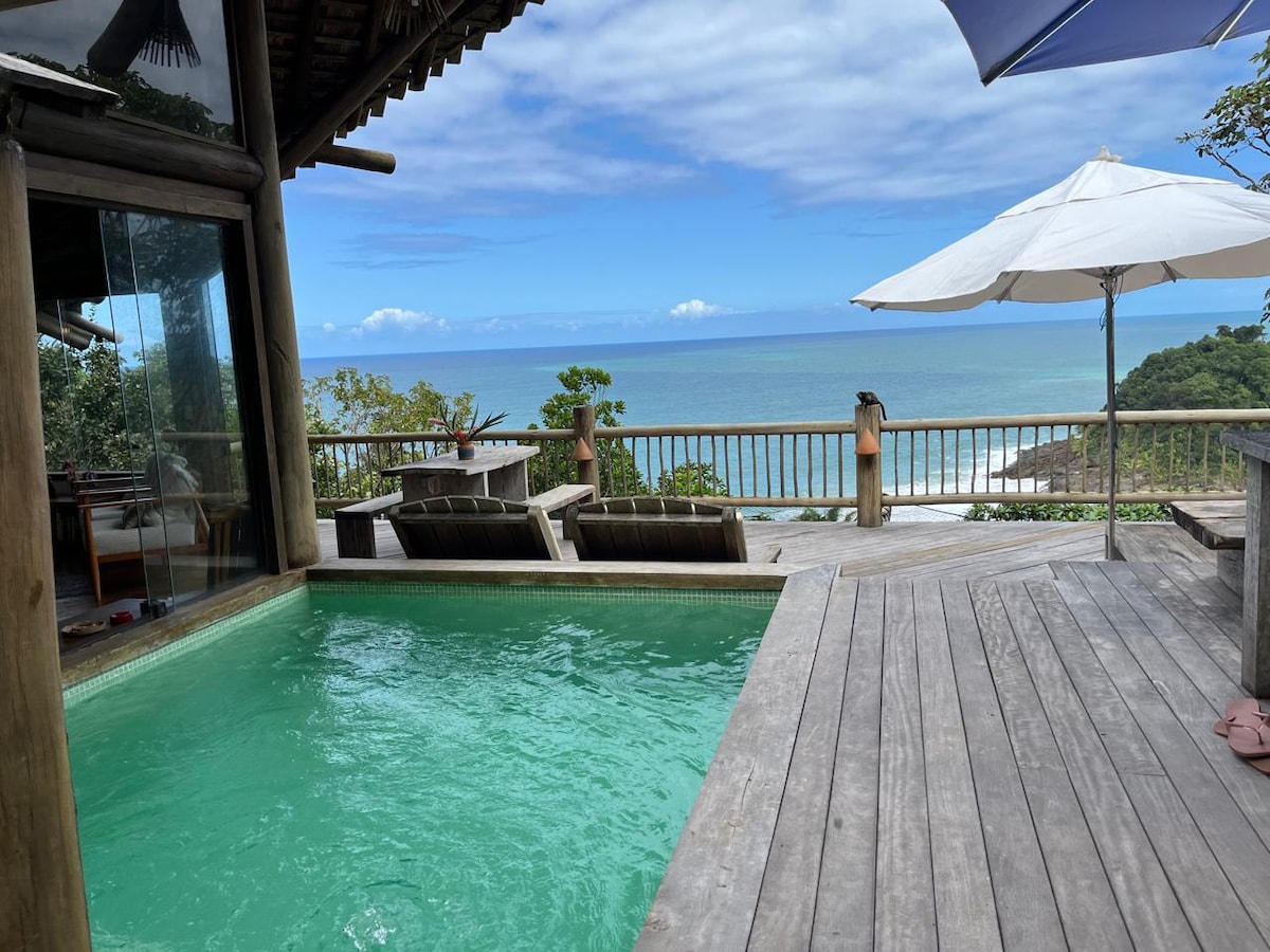 Um refúgio único, no meio das árvores, com vistas deslumbrantes. Perfeito para casais, famílias ou amigos. Acesso direto à Prainha, a mais linda e exclusiva de Itacaré, por escada privativa (em 3 minutos se está com o pé na areia). Maravilhosa piscina com borda infinita, ampla varanda e churrasqueira. Localizada no famoso condomínio Villas de São José, projetada por arquiteto renomado, com móveis de design e obras de arte. Excelente cozinheira à disposição, mediante pagamento de diária.
