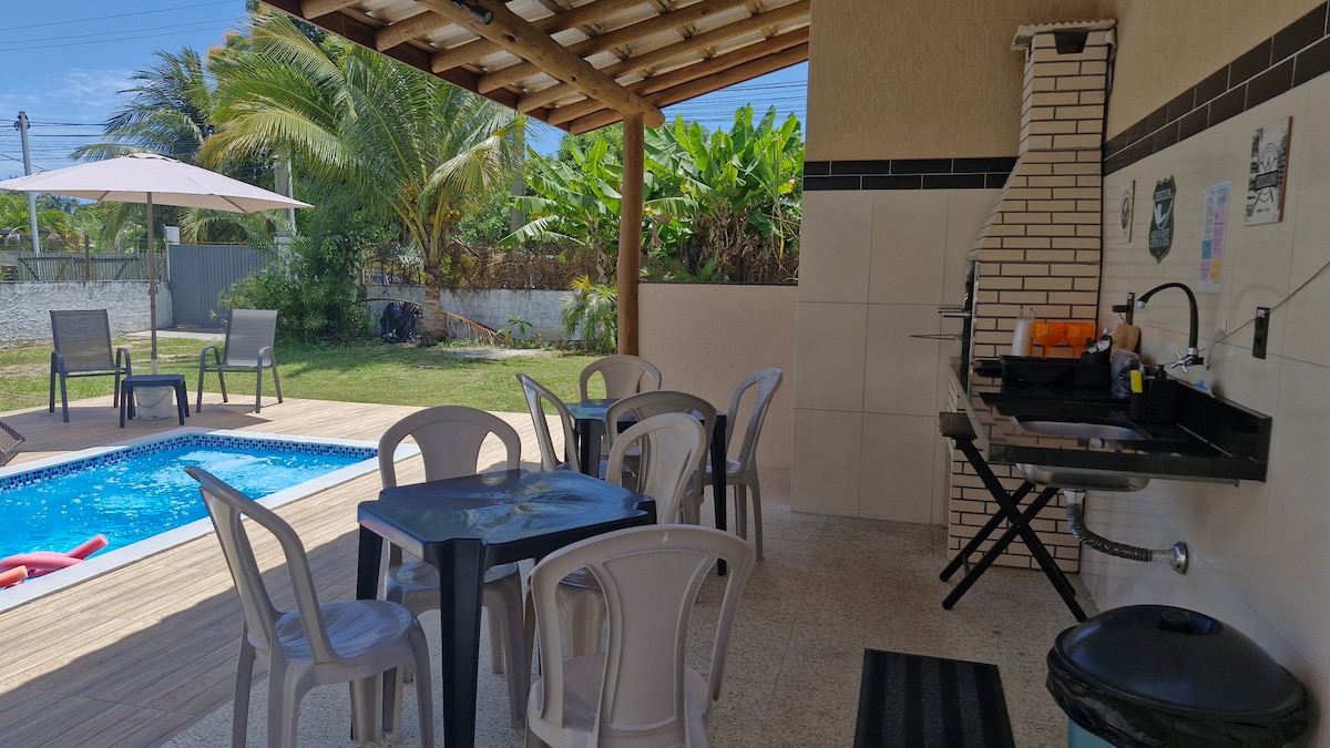 Vilage muito TOP, pé na areia, decoração náutica, fizemos tudo com muito carinho para que você sinta o prazer de uma bela casa de praia, com toda a infra que um condomínio pode oferecer, vc realmente acorda e dorme ao o som do mar. Há armários embutidos, 02 camas box + um box com auxiliar, que aberto fica do tamanho de uma king, roupa de cama e toalhas 100% algodão, ar condicionado nos três quartos, máquina de lavar roupas, máquina de café NESPRESSO, um belo VIOLÃO disponível