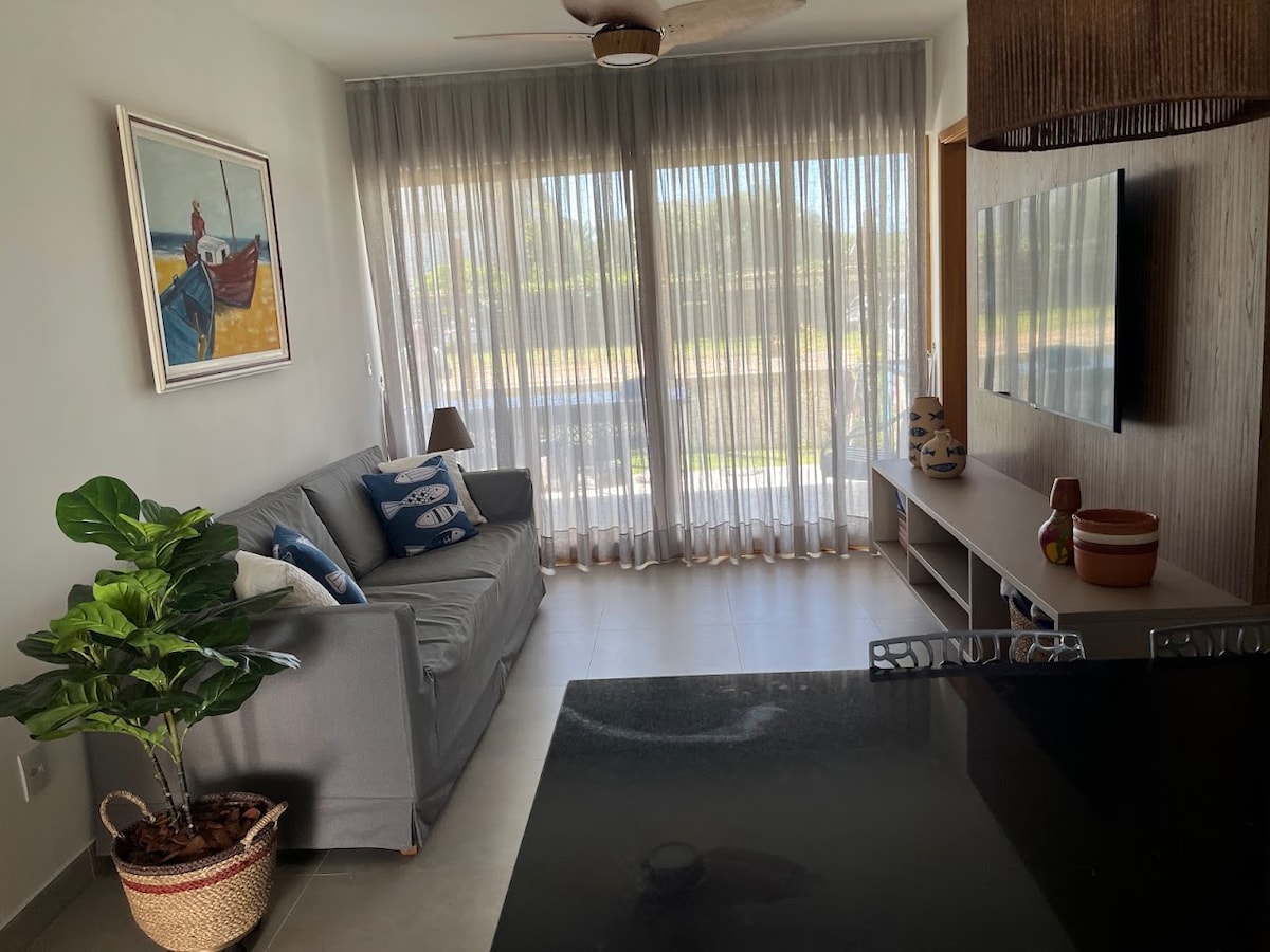 O apto tem vista para o mar, piscina e jardim da varanda privativa. Sinta-se na Bahia. Super bem decorado no estilo boho praiano, bem iluminado e ventilado pela brisa mar. Possui 3 quartos sendo uma suite com estação de trabalho. Todos possuem ar-condicionado. Com enxoval completo e todos os itens de cozinha para uma curta ou longa estadia. Disponibilizamos um kit criança com brinquedos, cadeira alta de alimentação, banheira e berço dobrável, quarto c/ beliche. O condominio não permite pets.