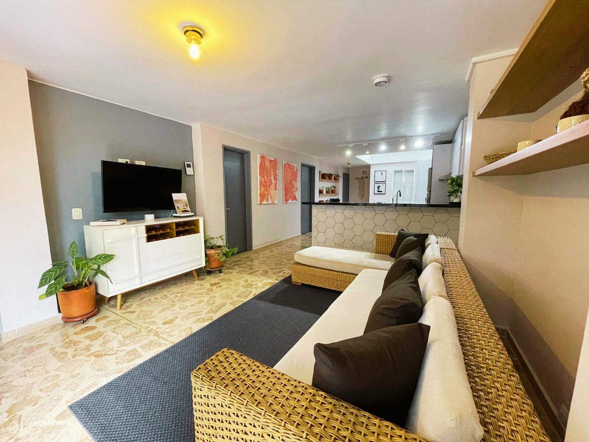 Welcome to your modern top-floor studio in trendy Laureles! Enjoy chic design, relaxing comfort, and a 5-minute walk to top dining and nightlife. This retreat includes 1.5 baths, full kitchen, A/C, in-unit washer/dryer, private + guest parking. Relax with fast fiber internet, Smart TV, and city views from your private balcony. With 24-hour security and spotless standards, peace of mind is assured. Perfect for digital nomads discover the best of Medellín in style and comfort.