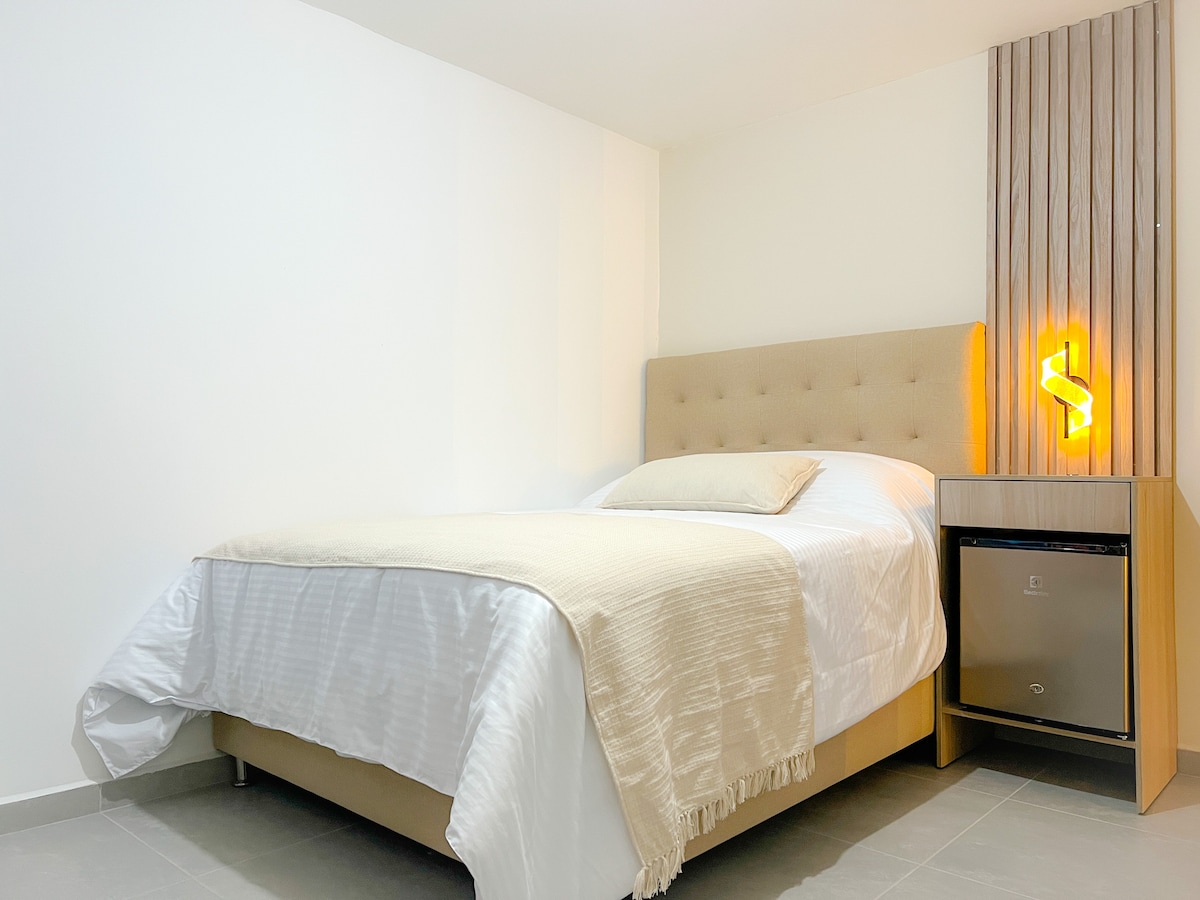 Pequeña y acogedora habitación en piso 2. de aprox. 16 mts2. con entrada independiente y terraza compartida, ubicado en zona rosa céntrica de uno de los barrios mas tradicionales y antiguos de envigado cerca al parque principal aprox. 8 min. Donde encontrarás muy cerca restaurantes, bares, mall comercial, cajeros, supermercados, farmacias y transporte publico. Se encuentra a unos 18 min. del Parque LLeras y Provenza en vehículo, y 20 min a pie aprox. a estaciones del metro Envigado y/o Ayurá.