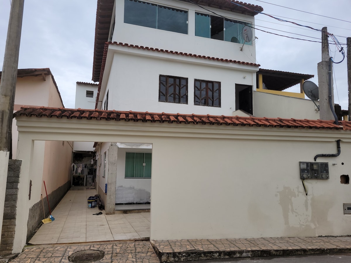 A parte a ser alugada é o segundo andar. LEIA TODO O ANUNCIO COM ATENÇÃO. Distância da praia: 3 minutos de carro, 15 a 20 minutos de a pé. Entrada de hospedes com acesso privado e garagem para 02 carros. Na casa tem: 02 Quartos de casal 01 quarto com beliches 02 banheiros. 01 cozinha com itens básicos. 01 Sala de TV e Wi- fi. 01 churrasqueira na varanda. Na casa não tem: Toalha Lençol Coberto Acessórios de higiene pessoal. FICA POR CONTA DO HÓSPEDE TRAZER.