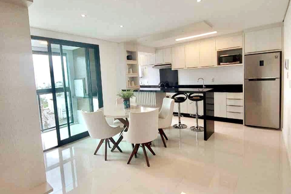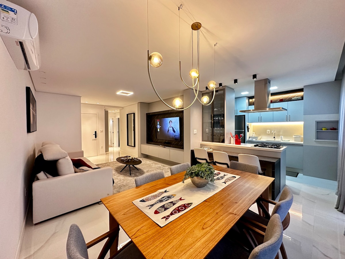 Lounge Apartment, located 5 minutes from Brava Beach and 10 minutes from Balneário Camboriú. The location is perfect. Only 5 blocks from Beach. Close all parties and restaurants. Condo with complete infra, Pool, Gym, Steam and 5 Barbecues. The apartment has Mountain-facing Jacuzzi with hydro and chromotherapy. Ideal for relaxing or take a romantic time. It has 58 'smart TV in the living room and 40' in the bedroom. Full kitchen. Machine washes and dries. You will love this place.