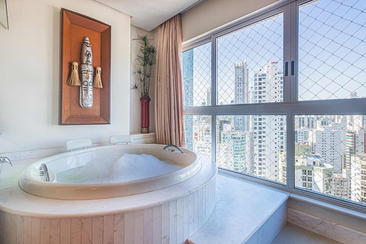 Lounge Apartment, located 5 minutes from Brava Beach and 10 minutes from Balneário Camboriú. The location is perfect. Only 5 blocks from Beach. Close all parties and restaurants. Condo with complete infra, Pool, Gym, Steam and 5 Barbecues. The apartment has Mountain-facing Jacuzzi with hydro and chromotherapy. Ideal for relaxing or take a romantic time. It has 58 'smart TV in the living room and 40' in the bedroom. Full kitchen. Machine washes and dries. You will love this place.