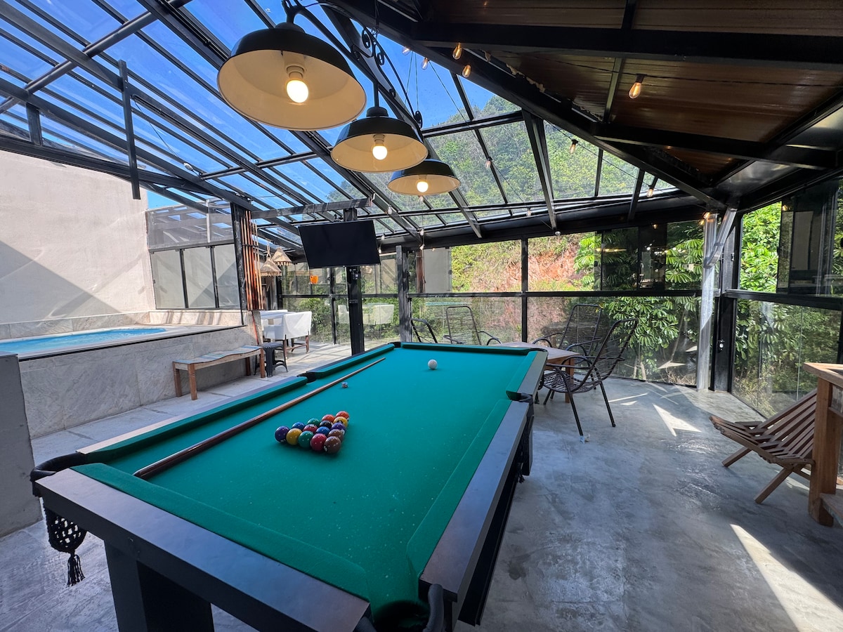 Não alugamos para festas/eventos* Casa ampla com excelente área de lazer Possui dois andares sendo o segundo com 04 quartos climatizados, todos com cama box casal (sendo 01 suíte master) + 02 colchões de casal (8 hospedes nas camas e mais 4 nos colhões) 03 banheiros 01 lavabo 02 cozinhas completas e equipadas Churrasqueira à carvão e Espaço de jogos com mesa de sinuca e pimbolim Piscina com cascata e deck