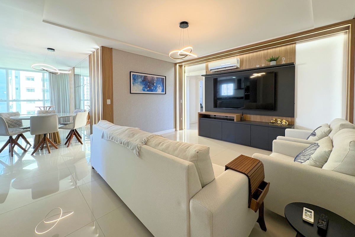Alto padrão c/ vista mar parcial, 4 Suítes e amplo Living. Localização excelente no centro de Balneário Camboriú, 200 da praia (3 min a pé), a 1 passo da Av. Brasil, perto de mercado, comércio e restaurantes. Preparado e equipado p/ hospedar c/ conforto e comodidade: -Ar condicionado sala e quartos -Cama King, Queen e Casal -Smart TV 75’’, 43 e 32 -WiFi -Cozinha completa -Máquina lava e seca -Churrasqueira a gás -2 vagas garagem Ideal para famílias e casais. Aproveite o melhor de BC!