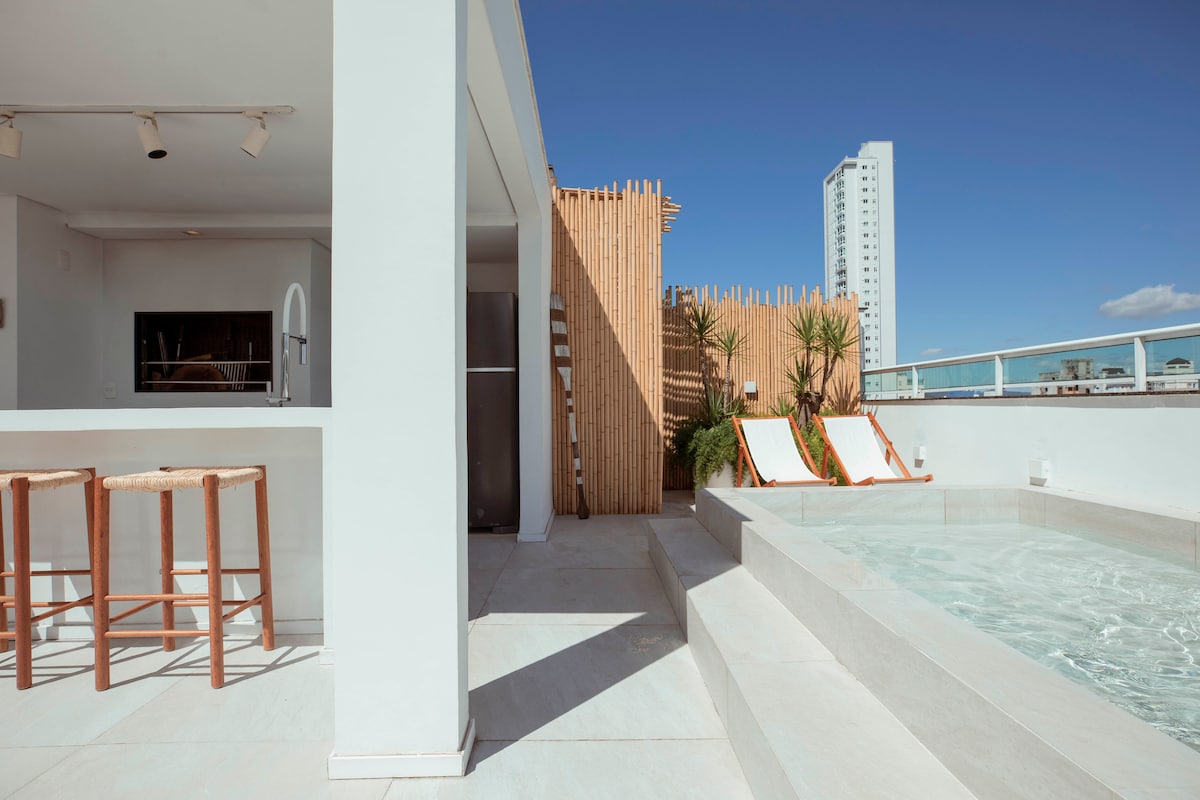 Cobertura no centro de Balneário Camboriú. Lozalizada no coração da cidade, ela possui 450m² de área privativa, destacando-se a piscina e jardim exclusivos. Ela acomoda até 8 pessoas, com 3 suítes mais um quarto. Bem equipada, espaçosa e diferenciada, a locação a dispõe de 3 vagas de garagem . Além disso, ela possibilita a vizualização panorâmica em 360 graus da cidade, podendo olhar tanto o mar (1 quadra de distância), quanto toda a parte urbana, incluindo pontos turísticos.