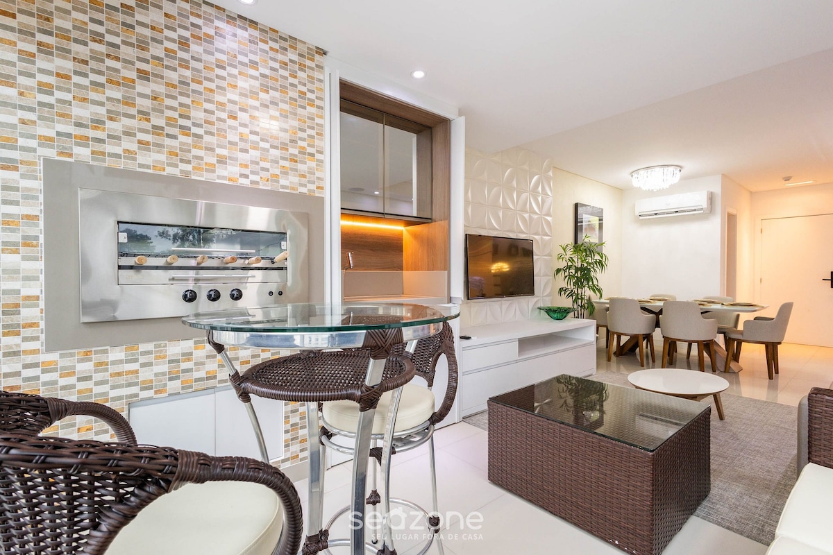 Perfeito para famílias que buscam conforto e sofisticação, com a beleza do mar à sua frente! Localizado na região central, à 30 metros da praia. * Churrasqueira à carvão com espetos giratórios, para churrascos inesquecíveis. * Adega climatizada e cervejeira. * Ares-condicionados em todos os ambientes. * 4 suítes com smart tvs. * Enxoval premium (cama, banho e mesa). * Wi-Fi exclusivo. * Elevador social privativo. * Garagem para 2 carros. * Serviço de organização diária contratado à parte.