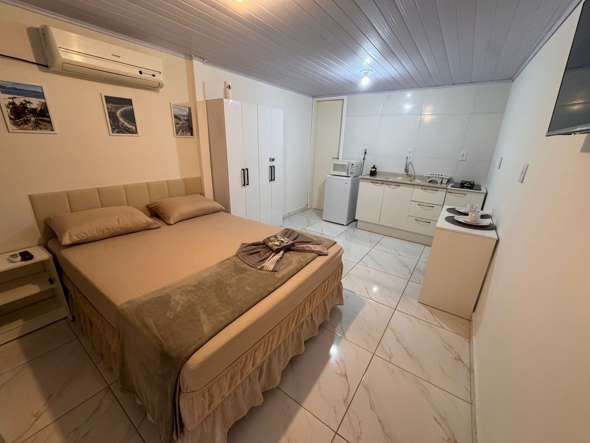 Lugar aconchegante, a 2min do mar. Estacionamento não demarcado (1 carro médio ex: Tracker), não é gaveta. Kit praia: cooler, 2 cadeiras, guarda-sol. Cozinha equipada com utensílios, purificador de água, geladeira, forno, fogão de indução, micro-ondas, ferro, chaleira elétrica. Cozinha integrada com a sala com smart TV e sofá cama King 1 quarto com 1 Cama queen, 2 colchões de solteiro e mini berço opcional 1 banheiro completo Cortinas blackout, ar cond. frio na sala e quarto, aquecedor elétrico