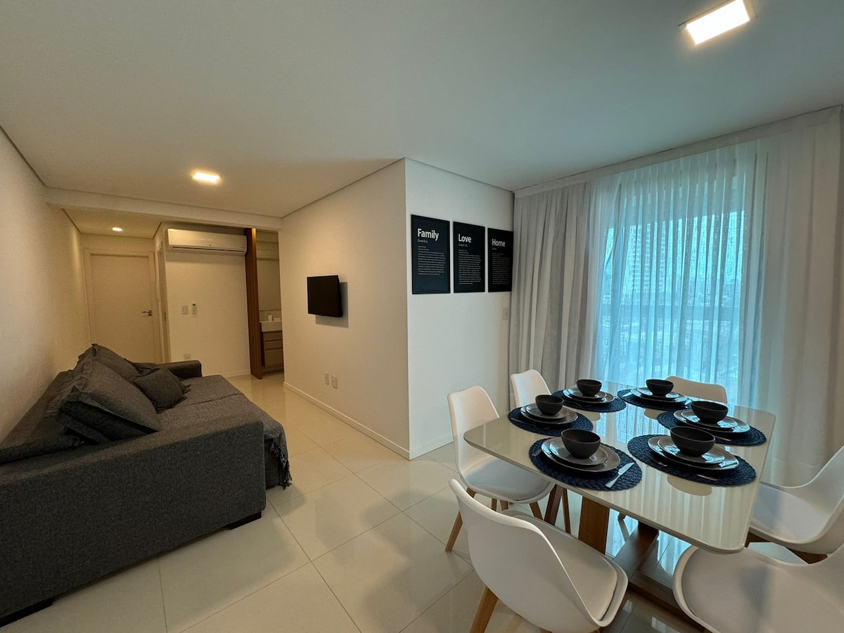 Lounge Apartment, located 5 minutes from Brava Beach and 10 minutes from Balneário Camboriú. The location is perfect. Only 5 blocks from Beach. Close all parties and restaurants. Condo with complete infra, Pool, Gym, Steam and 5 Barbecues. The apartment has Mountain-facing Jacuzzi with hydro and chromotherapy. Ideal for relaxing or take a romantic time. It has 58 'smart TV in the living room and 40' in the bedroom. Full kitchen. Machine washes and dries. You will love this place.