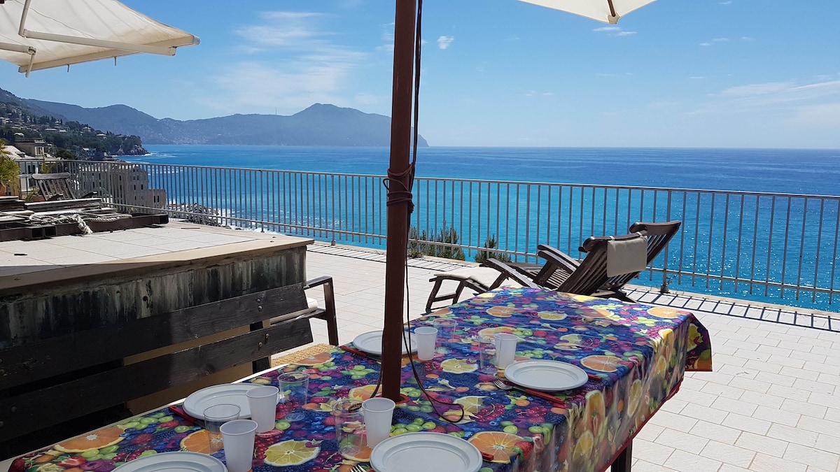 La casa è totalmente indipendente, immersa nel verde dell'uliveto ligure, con una vista mozzafiato sul Golfo Paradiso. Il panorama fruibile dalle terrazze e dalle finestre si apre dall'estremo ponente ligure al Monte di Portofino e nelle giornate limpide fino all'arcipelago toscano e la Corsica. Il mare (500 m.) Recco(1200 m.) il Parco Nazionale di Portofino(3km) sono raggiungibili oltre che in auto, anche a piedi con panoramiche passeggiate; Genova-Nervi dista 12 km (SS1 Aurelia)