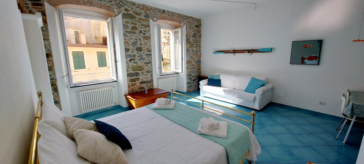CODICE CITRA 011024-LT-0007 ... A wide, airy, sunny, high ceiling studio at exactly the heart of the village of Riomaggiore, ideally situated for visiting the Cinque Terre. The railway station, the boats, the shuttles, the paths at a walking distance of few meters. All kinds of shops at the same distance.The studio has been renovated in 2016, keeping when possible, the original features (1600); it is well soundproofed and air-conditioned and equipped with all comforts, with a large bathroom