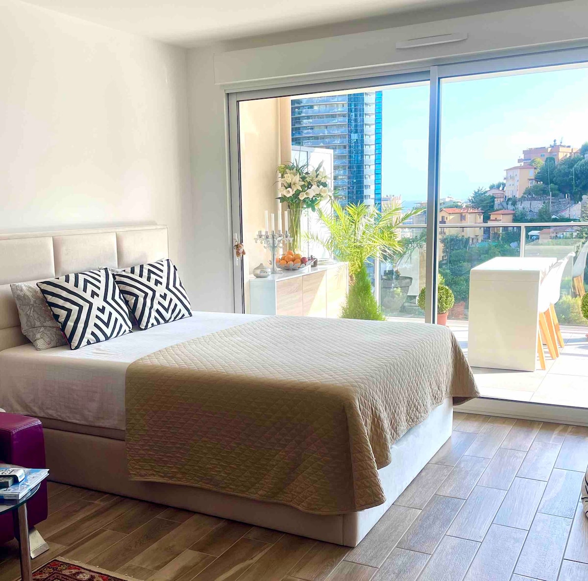 Magnificent, very cozy and modern apartment with a separate bedroom, a large living room and a sunny terrace with a beautiful sea view! New fully equipped kitchen! The apartment can accommodate up to 4 people. Apartment Renovated in September 2021! 5 minutes walk to Grimaldi Forum and Larvoto beach
