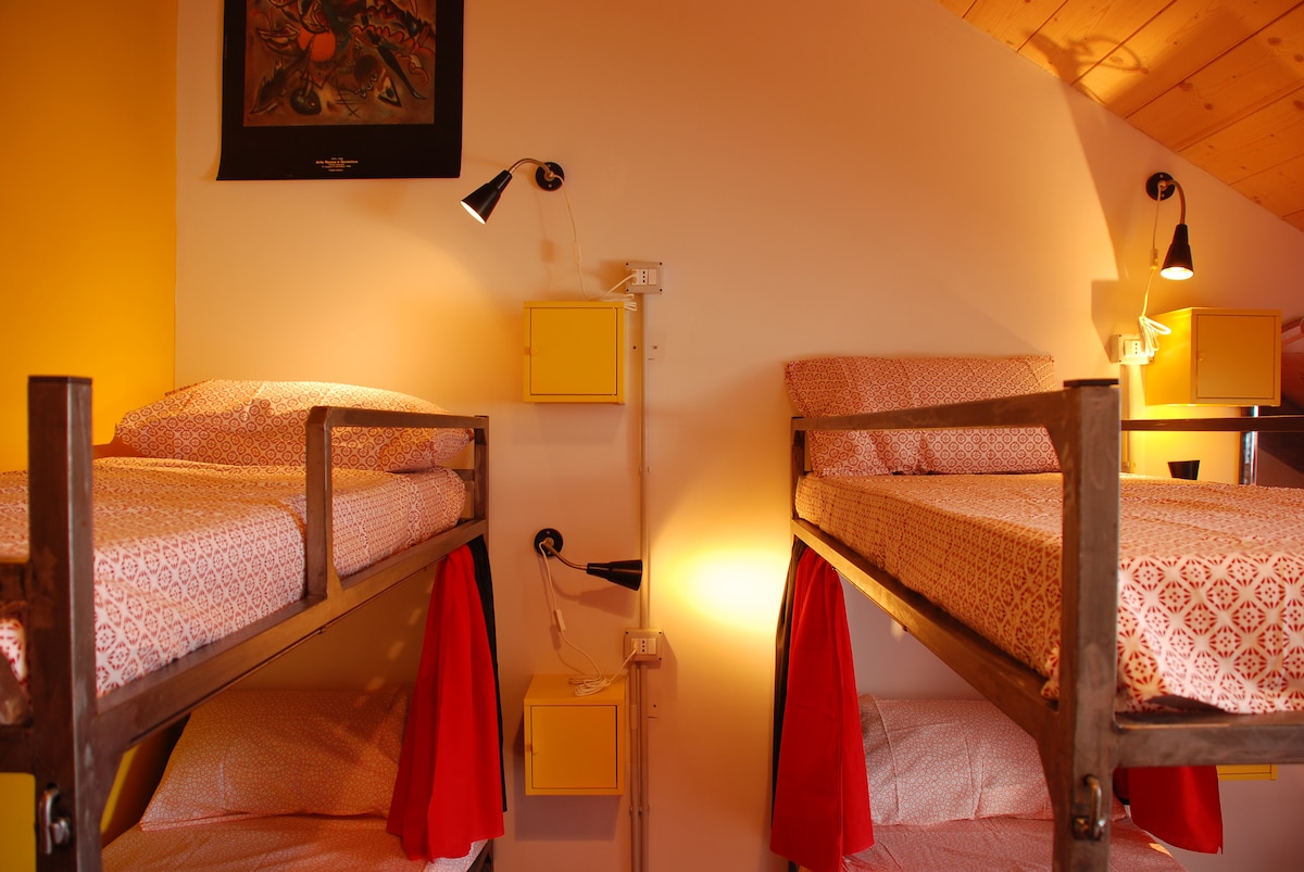 Posto letto in dormitorio di 2/3 letti a castello (massimo 4-6 persone). Camera di ampie dimensioni (25- 30 m²) dotata di bagno privato. La prenotazione on line deve essere effettuata un posto letto alla volta. - Asciugacapelli a richiesta alla reception - WI-FI ( in tutta la struttura), bollitore e microonde nelle aree comuni - Bici elettriche e colonnina di ricarica auto elettriche - Colazione - Servizi extra (a pagamento)