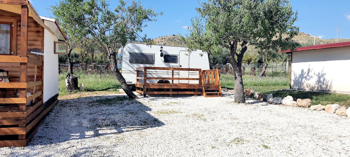 新房源在蒿属植物野营地的露营车中