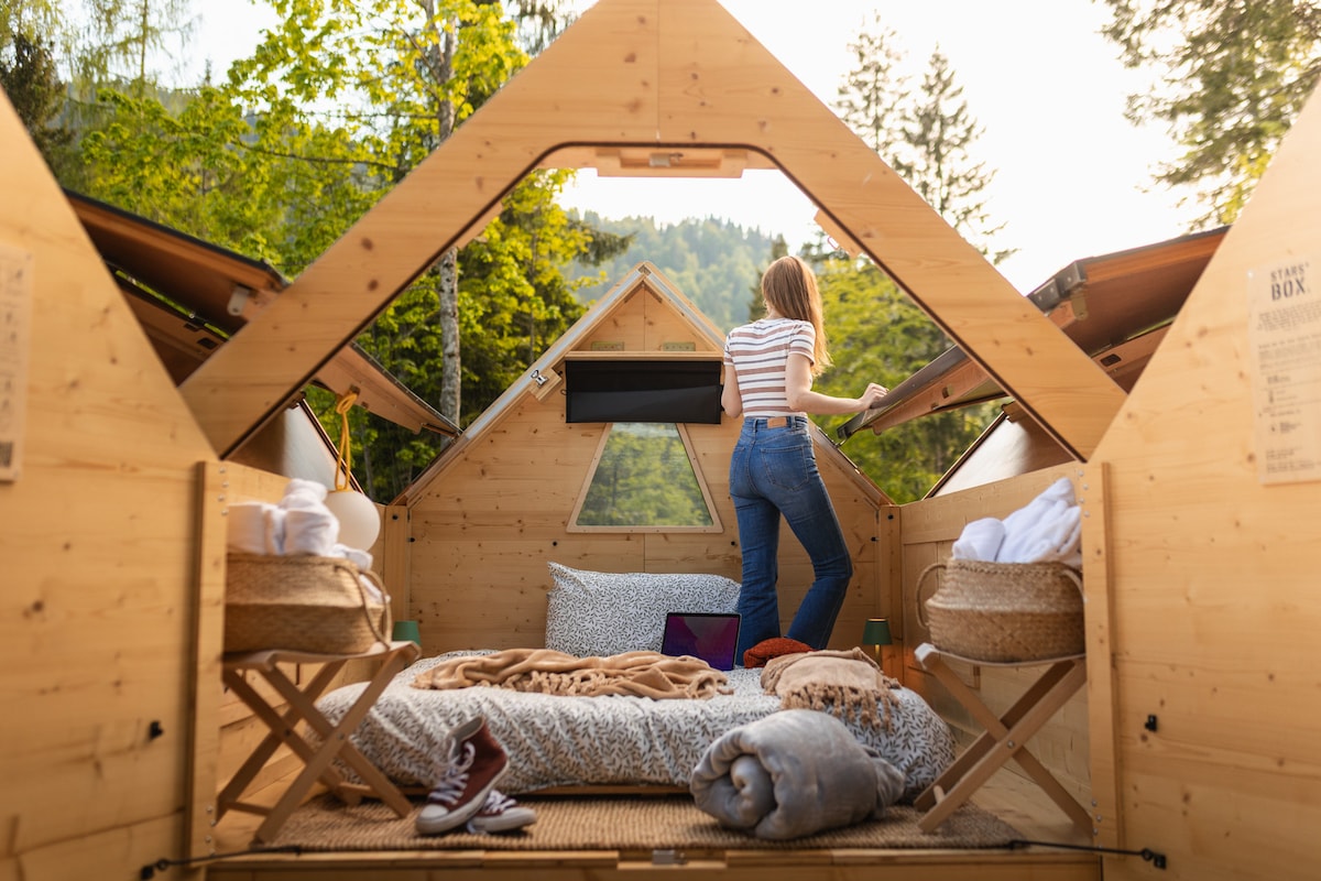 Is there anything more romantic than spending the night with your loved one under the Italian stars? Yes, an overnight stay in the minimalist StarsBOX where, thanks to an easy-to-open convertible roof and a comfortable mattress with duvet, you will be completely immersed in nature. The StarsBOX design is inspired by the temporary huts built by shepherds of the Ligurian Alps in harmony with the natural environment.