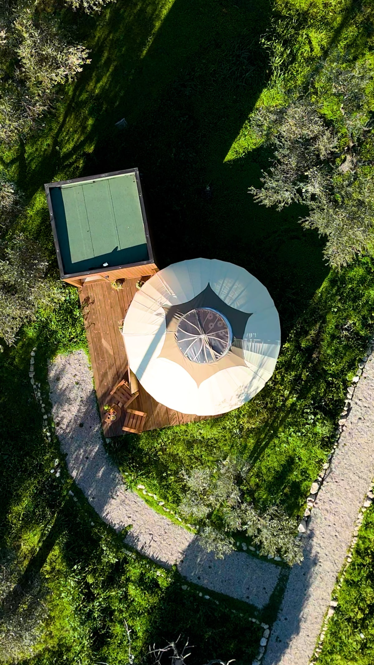 Our tents (diameter 5 metres - height 3 metres) offer exclusive comfort: a double bed (with the possibility of adding 2 more single beds) with bed linen, duvet and towels, power bank and a torch for every need. Outside, a table and two deckchairs under a canopy for unforgettable moments. Breakfast is included and you can relax in the barbecue area or cool off in the (shared) swimming pool. Shared bathroom with outdoor shower.