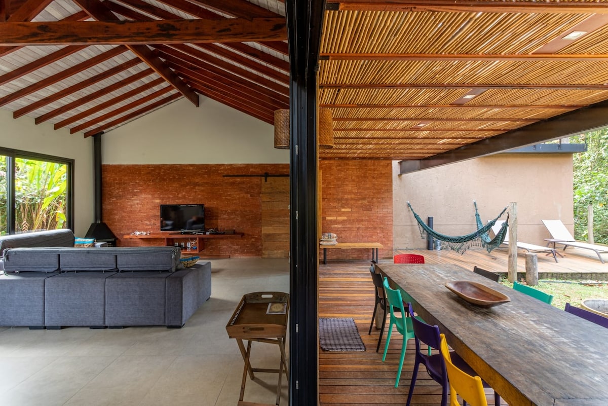 Projeto de Carlos Lemos, nossa casa é térrea, espaçosa, e super iluminada. Situada num terreno com vista privilegiada para o mar e as montanhas. Está cercada pela mata atlântica, com poucos vizinhos, à cerca de 500mts da praia. A casa é bastante equipada com uma cozinha e lavanderia completas, e tem internet rápida (100Mb) com wi-fi em todos os ambientes. A sala de estar tem lareira e a varanda área externa é bastante ampla com deck, redes e churrasqueira portátil.