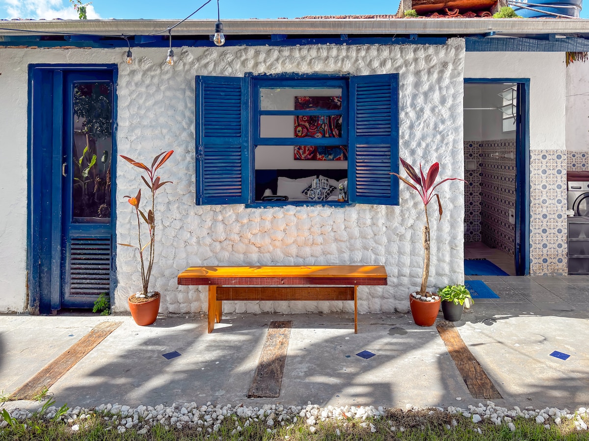 Espaço completo para 01 casal, área útil 45m2 em propriedade com outras unidades. 01 vaga carro descoberta, portão automático. Cama Queen, Ar 12000 BTU, ventilador, smart TV 50", cozinha exclusiva com microondas, frigobar, fogão 02 bocas sem forno, liquidificador, sanduicheira, cafeteira, filtro de barro. Terraço com churrasqueira, Internet claro fibra, piscina compartilhada. Praia Vermelha Praia Vermelha 100m, Tenório 400m, Cedro 1 km. Muito verde, pássaros, som do mar e ar condicionado