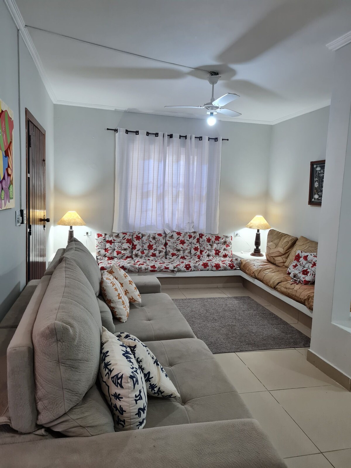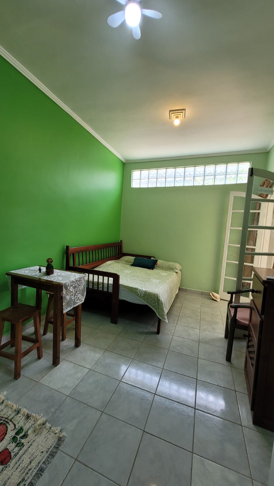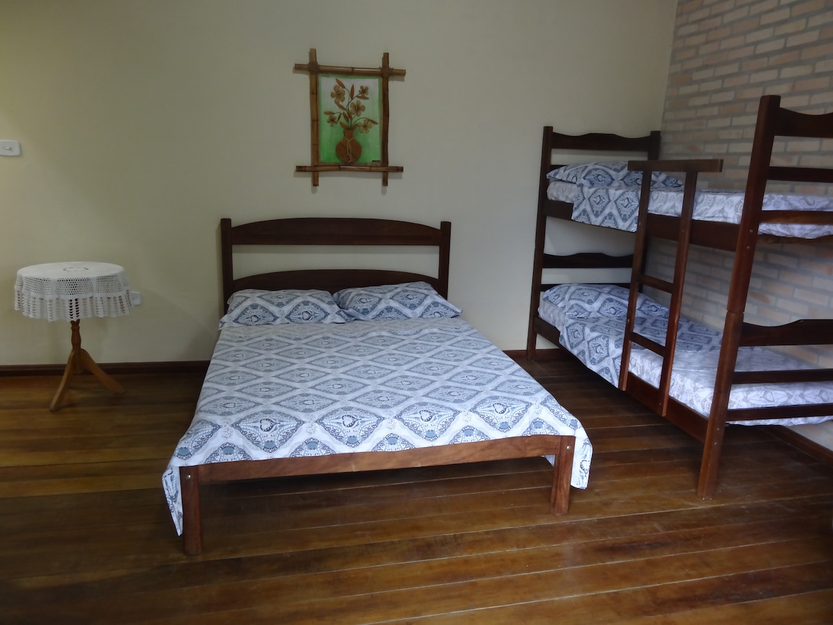 Suíte ampla com entrada independente. Cama Queen Size, Cama de Solteiro, Banheiro Privativo, Ventilador de Teto, Wi-Fi, Varal de chão e Mesa para Refeição. O quarto possui também uma pequena estrutura para o preparo de café da manhã ou lanches simples (frigobar, micro-ondas, cafeteira elétrica de coador, sanduicheira, pia e alguns utensílios). Não permitimos o uso de fogão elétrico ou a gás. Fornecemos roupas de cama e banho. Estacionamento Interno e Coberto