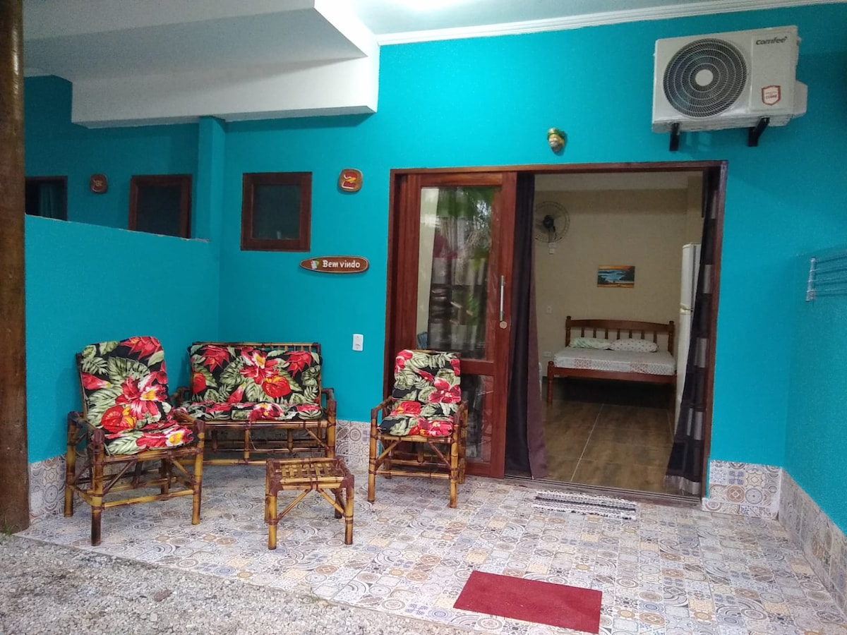 Suíte de hóspedes para 1 casal com varanda, entrada privativa, frigobar e estacionamento O espaço interno é amplo, bem arejado e iluminado, proporcionando uma atmosfera acolhedora e relaxante. Para sua comodidade, a suíte dispõe de frigobar, perfeito para guardar suas bebidas e lanches. Localizada a poucos metros da praia e do rio, a região oferece excelentes opções de lazer, como surf, caiaque e passeios ao ar livre.