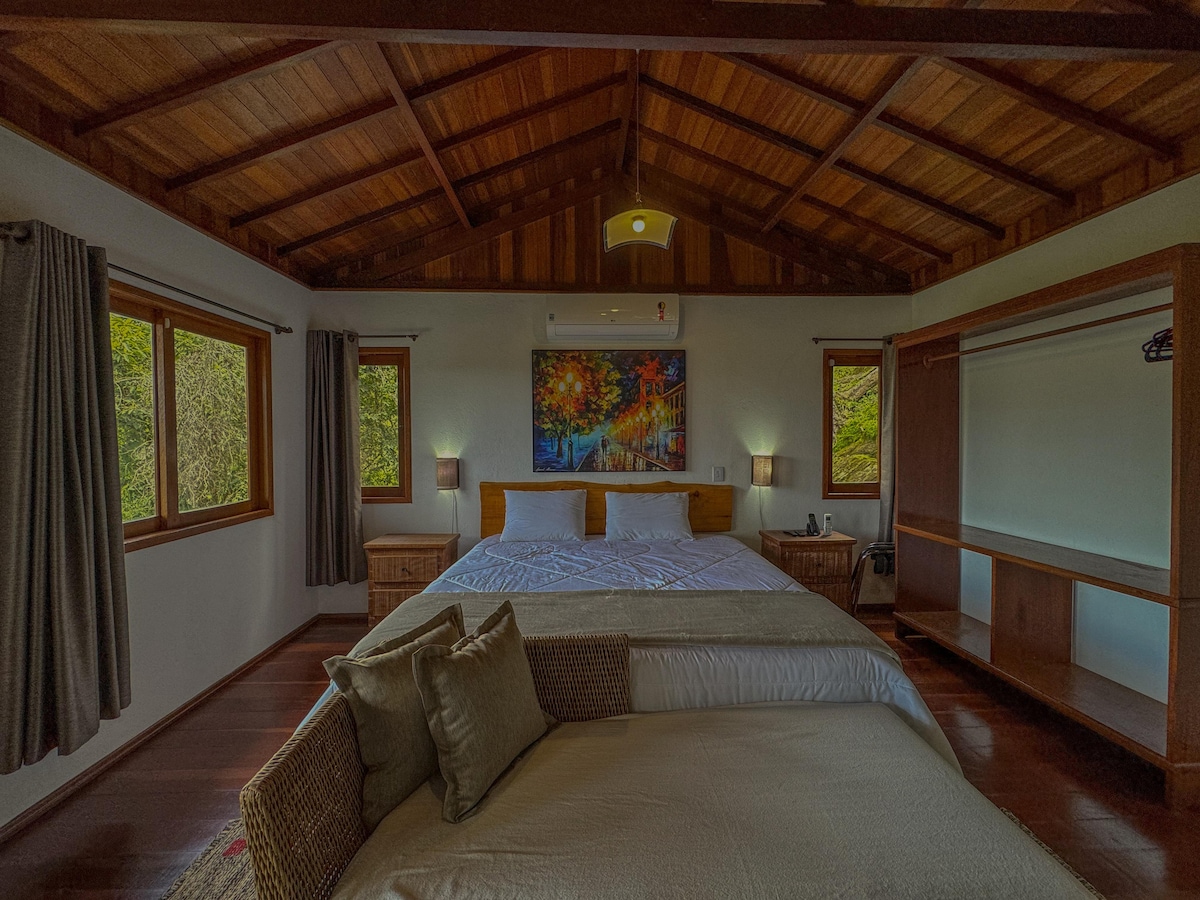 Chalé Vip de alto nível de acomodação, inaugurado em novvembro de 2023 ele foi idealizado para oferecer todo conforto requinte e praticidade, possue cozinha toda equipada, lareira de ferro fundido,adega climatizada, espaço fogueira, onde as noites ficam mais aconchegante, espaço chuveiro , espaço home office , estacionamento coberto e privativo. Os hóspedes poderão usufluir com exclusividade da pousada a beira de rio com deck.