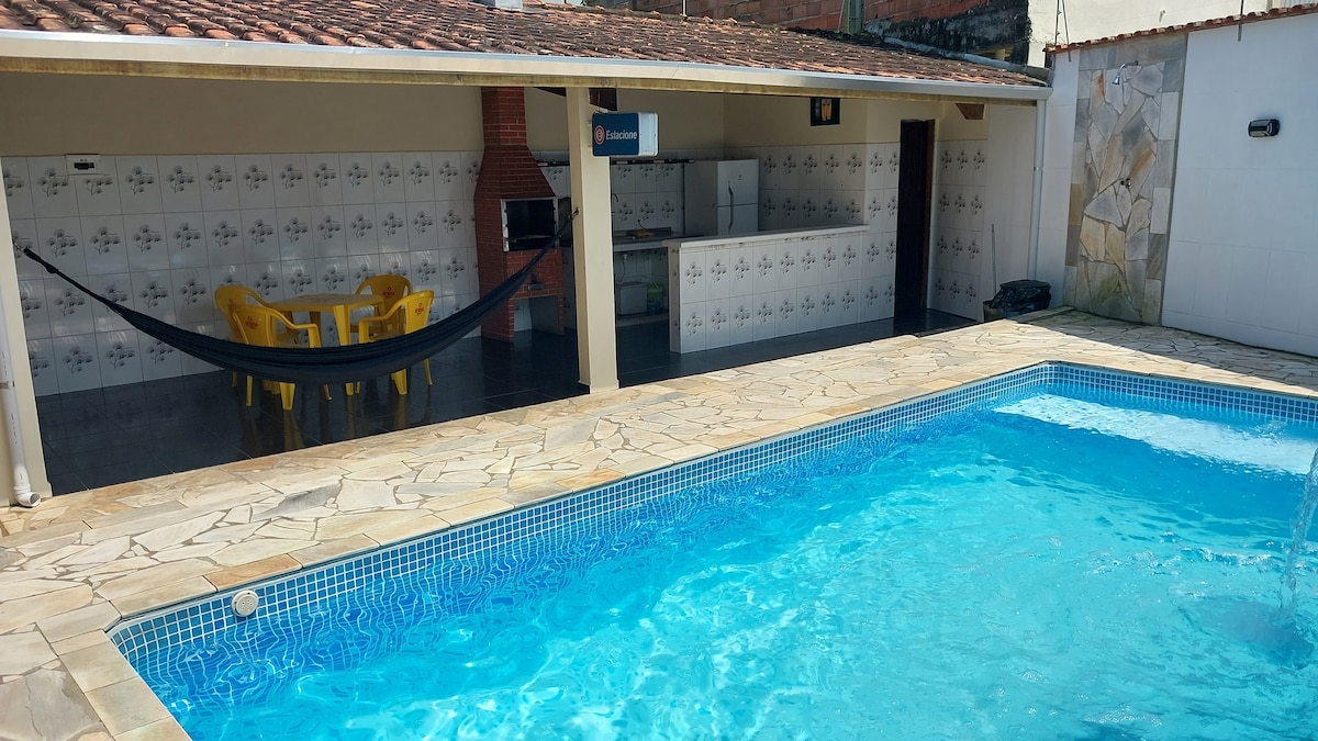 Espaço privativo para hospedes, piscina com cascata, banheiro com chuveiro quente, ducha fria próximo a piscina, geladeira, fogão, forninho elétrico, panela elétrica, air fryer, pratos e talheres, churrasqueira e kit churrasco. servimos porções: camarão, calabresa, frango a passarinho, batata frita, (não estão inclusos na diária) Rua particular, sem saída, asfaltada, a 10 min. a pé da praia. obs: proprietário mora na casa da frente, edícula fica em espaço reservado e privado aos hóspedes. .