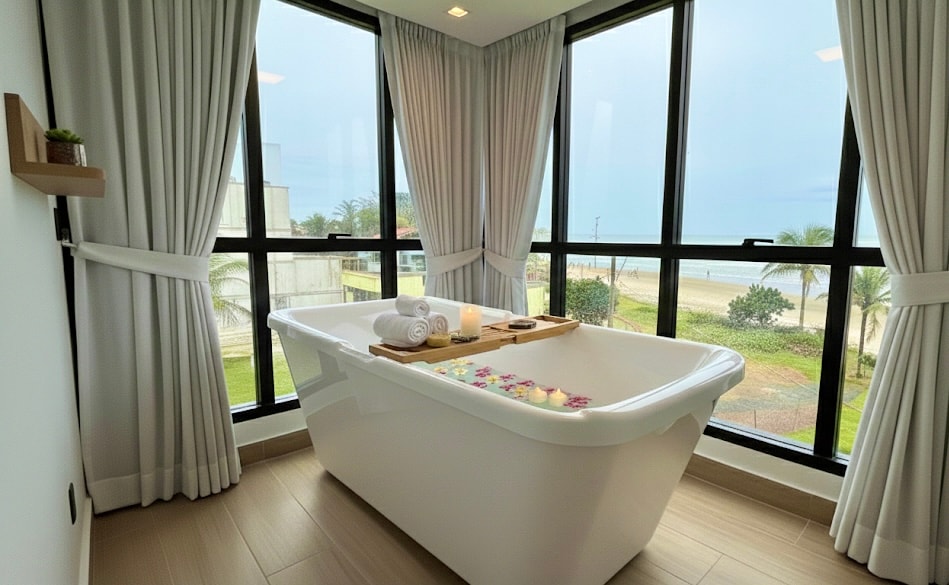 Aconchegante e ideal para casais ou pequenos grupos de até 3 pessoas, esta suíte oferece cama de casal e cama de solteiro, TV 32″, Wi-Fi, ar-condicionado, cortinas black-out, secador de cabelo e banheiro privativo. Conta com janela com vista para o mar, perfeita para relaxar e se conectar à natureza. Os hóspedes aproveitam piscina de borda infinita, sauna, bar da piscina, salão de jogos, brinquedoteca, solarium e café da manhã incluso. Jacuzzi disponível mediante taxa adicional.